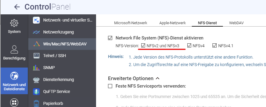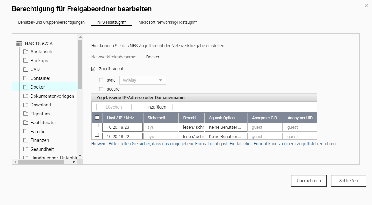 NFS-Freigabe erstellt und die IP-Adressen der VMs eingetragen. Zwecks Zugriff bin ich wie folgt vorgegangen:- Installation des NFS client package