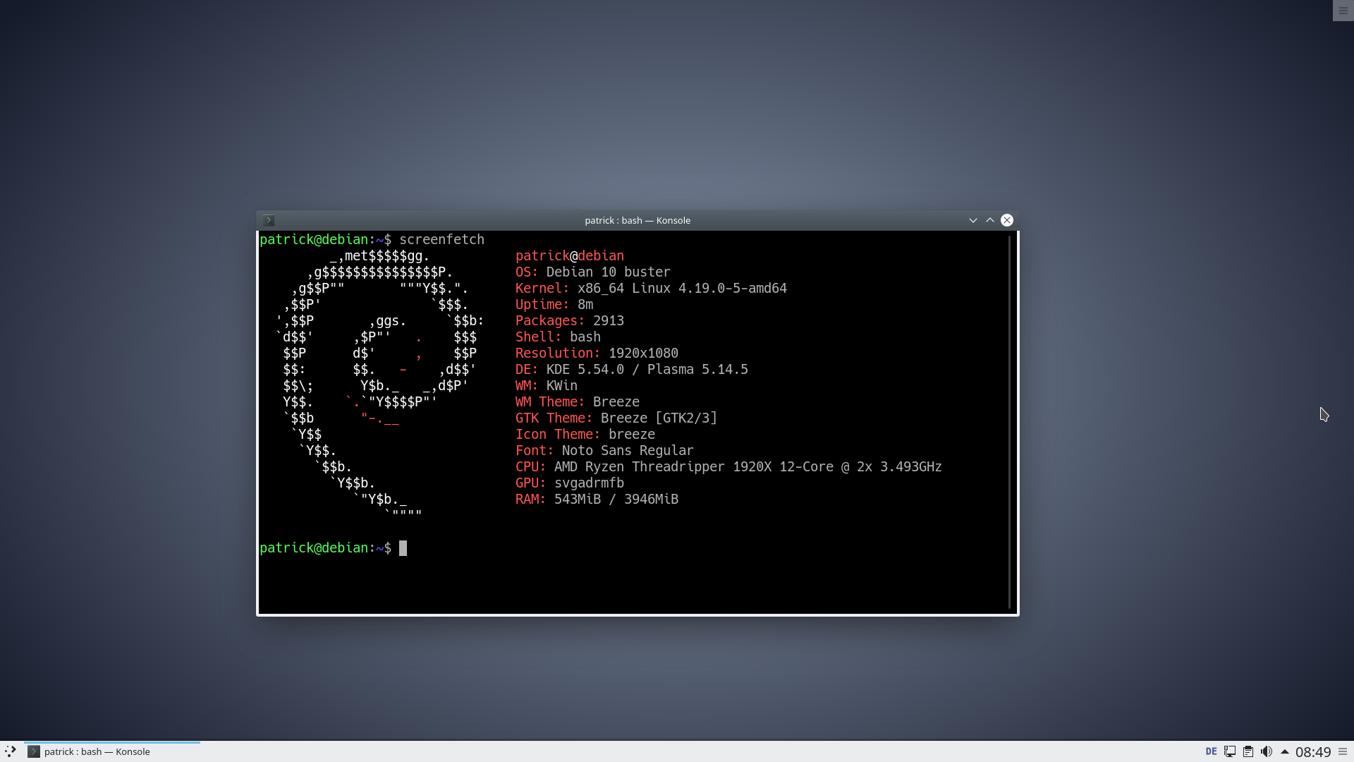 Debian Buster hat einen erstaunlich niedrigen 567MB RAM Verbrauch für eine KDE Plasma Ausgabe.