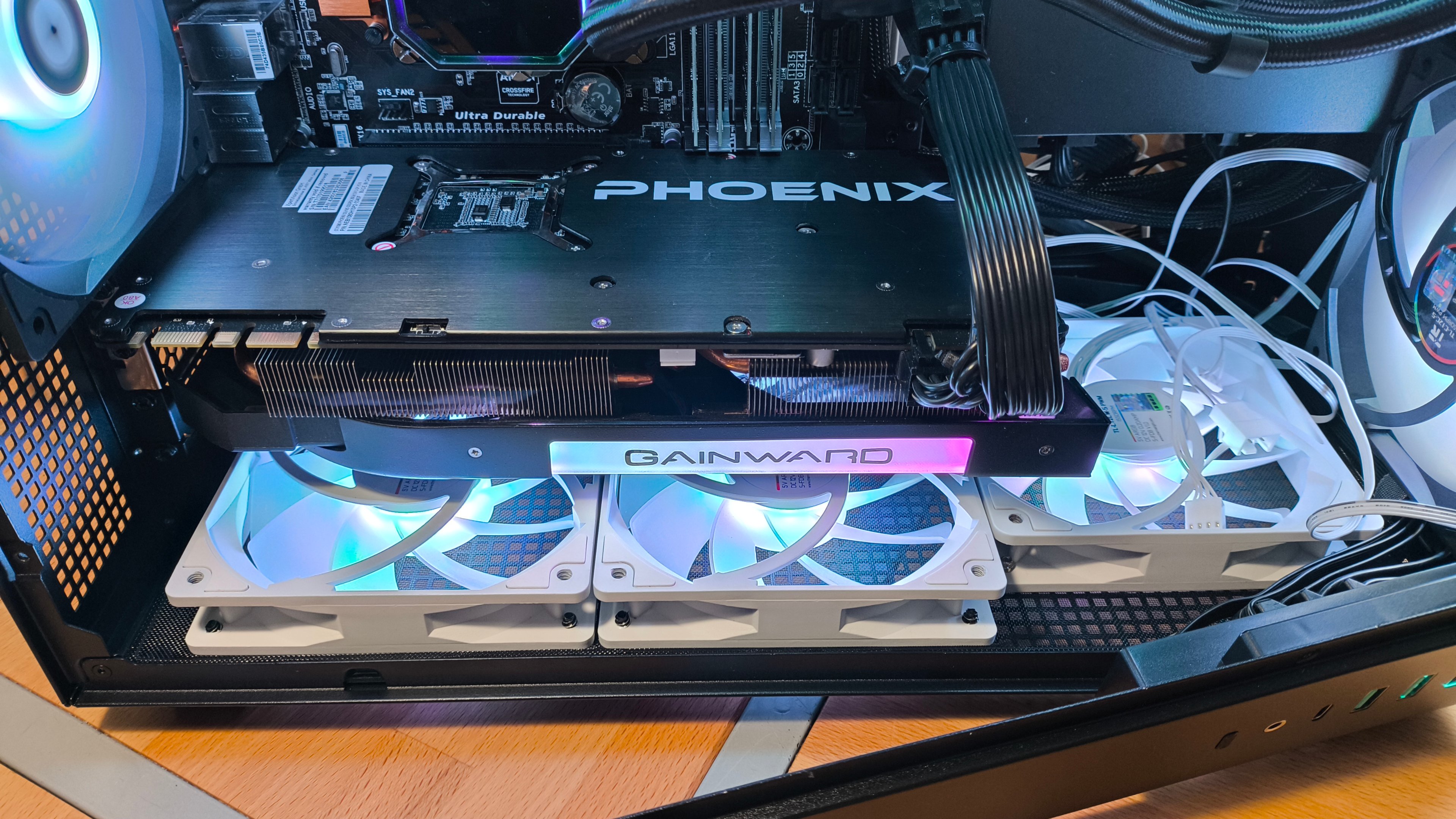 Die weißen Lüfter dienen nur zur Anprobe, weil grad nichts anderes da war. Nachdem die Anprobe positiv verlaufen ist, habe ich sofort drei schwarze Reverse-Lüfter bestellt.