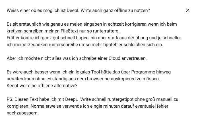 DeepL Write muss ich mir noch ansehen. Da wäre ich eher ein Gelegenheitsnutzer und ein „Abo“ lohnt sich nicht.