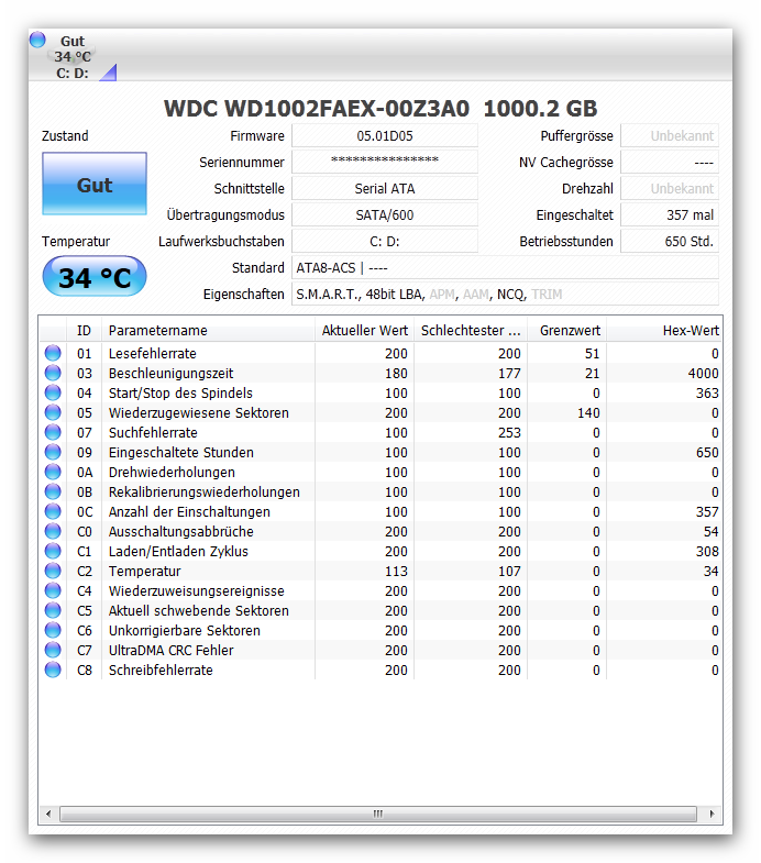 Ich habe schon in Crystal Disk Info geschaut, aber nichts besonderes festgestellt. Auch das Herstellertool von WD zur Überprüfung der Festplatte habe ich schon durchlaufen lassen - Ergebnis: Alles okay.