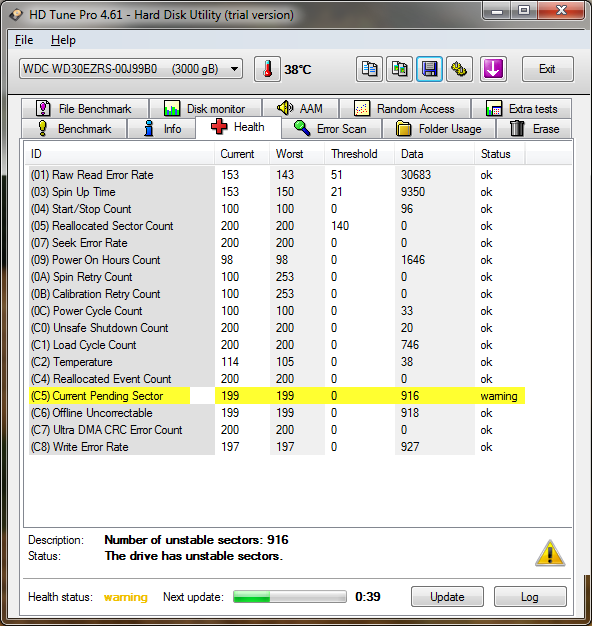 Anbei noch ein Screenshot von der HDD, wobei C5 schon seit ein paar Monaten bei 199 Pending Sectors stand.