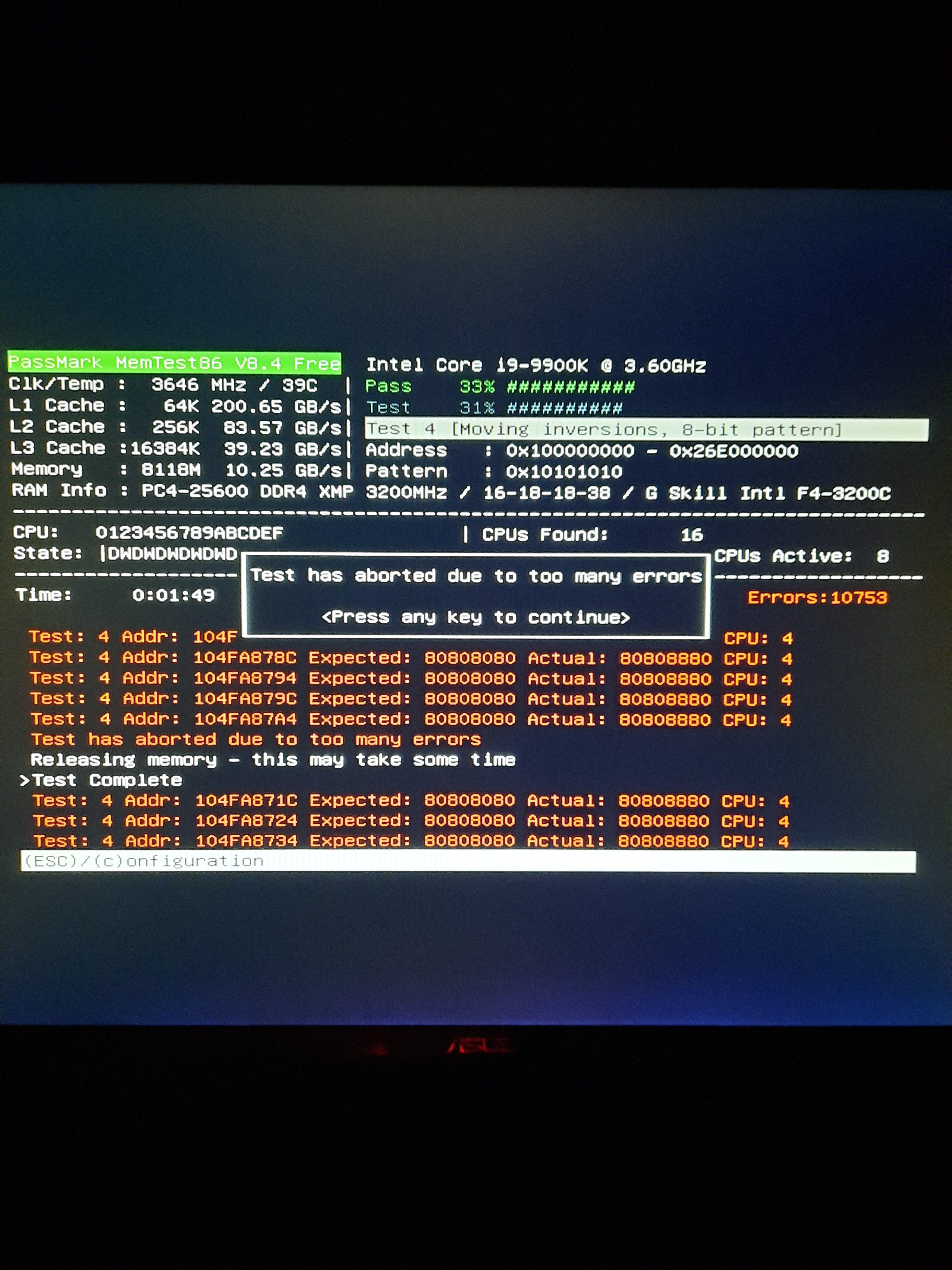 Habe 2x8GB DDR4 3200 Mhz Arbeitsspeicher in meinem System verbaut. Schon Zeit längeren habe ich Micro Ruckler und wenn in einem Spiel was lädt Tonaussetzer. Ich dachte mir es könnte der Arbeitsspeicher daran Schuld sein. Deswegen hab ich immer wiedermal die Window-Speicherdiagnose durchlaufen lassen, aber es wurde nie was gefunden. Irgendwie wurde ich stutzig und hab mir MemTest86 runtergeladen und siehe da ein 8GB Riegel ist defekt.