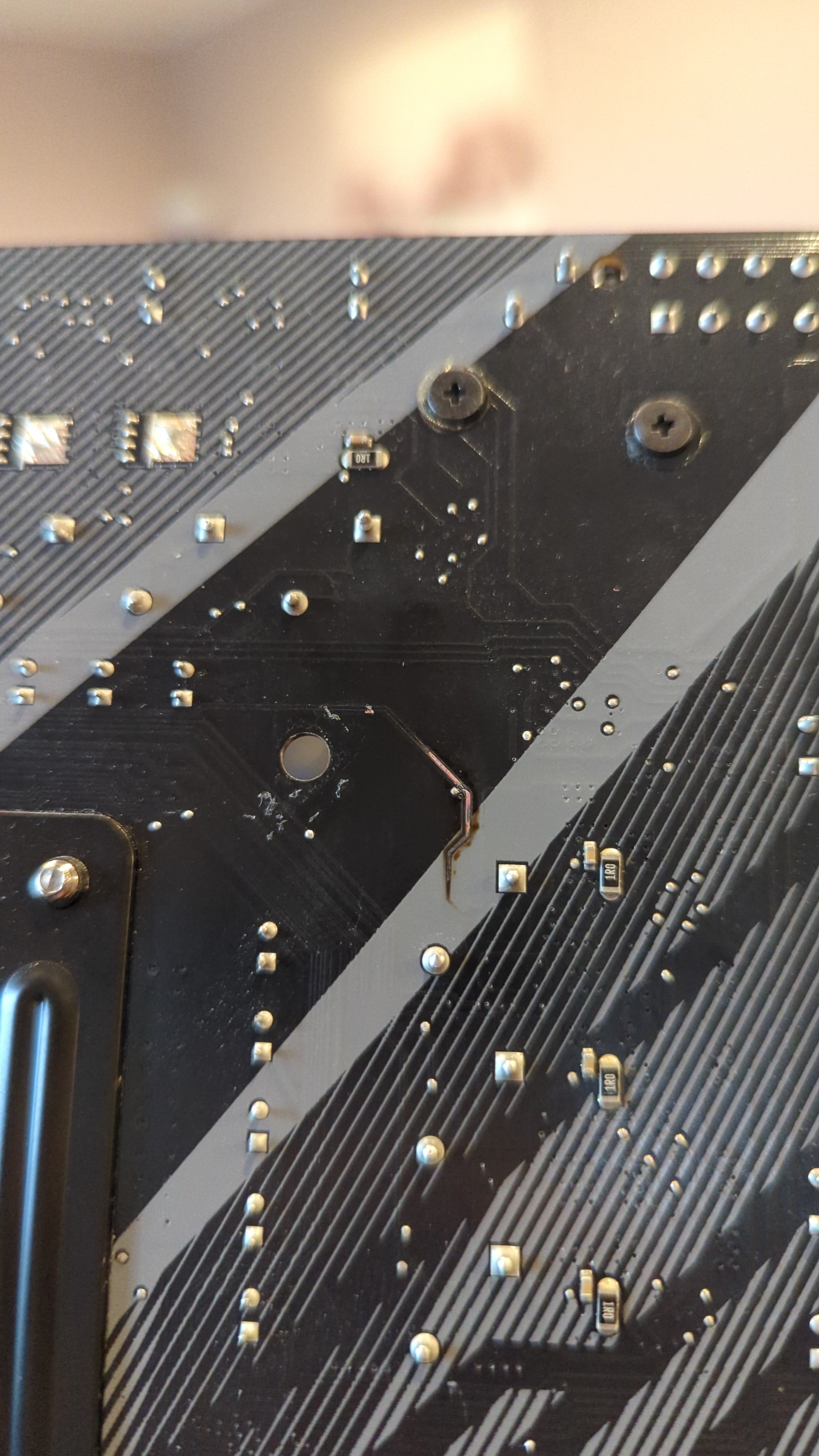 vorhin wollte der Rechner meiner Tochter nicht starten. Schlussendlich hab ich alles ausgebaut und diese (Foto) schöne Stelle auf der Rückseite des Mainboards entdeckt.