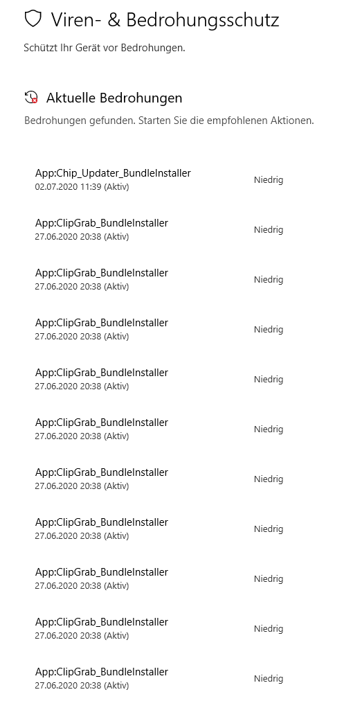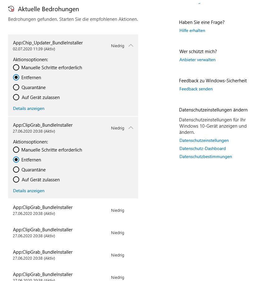 Hallo, wenn ich den windows 10 defender laufen lasse, findet der immer so alte Sachen (Bild 2), die Liste ist ewig, aber niedrige Gefahr. Bild 3 steht dann keine Bedrohungen gefunden. Will ich das Zeug von Bild 2 entfernen (Bild 5) und klicke unten auf Aktion, lande ich wieder bei Bild 3 oder es schließt sich einfach.