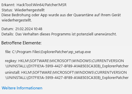 Ich habe so langsam das Gefühl, Microsoft hat mit irgendeinem Update seit einigen Wochen den Defender in seinem Verhalten verschärft. Ich teste ja gerne mal Alternativen zu von mir verwendeten Programmen und seit einigen Wochen blockiert der Defender manche Programme schon bei der Installation (in dem Fall dann die Ausführung im Ordner für die temporären Dateien), selbst wenn die Setup-Datei aus vertrauenswürdigen Quellen kommt. Letztens war es ein Tool von Western Digital, heute hatte ich das dann mal wieder bei dem Versuch, nen Musik-Converter zu installieren. Nach mehreren Anläufen, mit dem Klick auf "Blockierung aufheben" in der Warnmeldung das zu beheben, hat die Installation später auch geklappt. Allerdings sprang die Blockierung wieder an, als ich dann im Programm die Sprache auf Deutsch umstellen wollte. Im Schutzverlauf sieht das dann so aus: