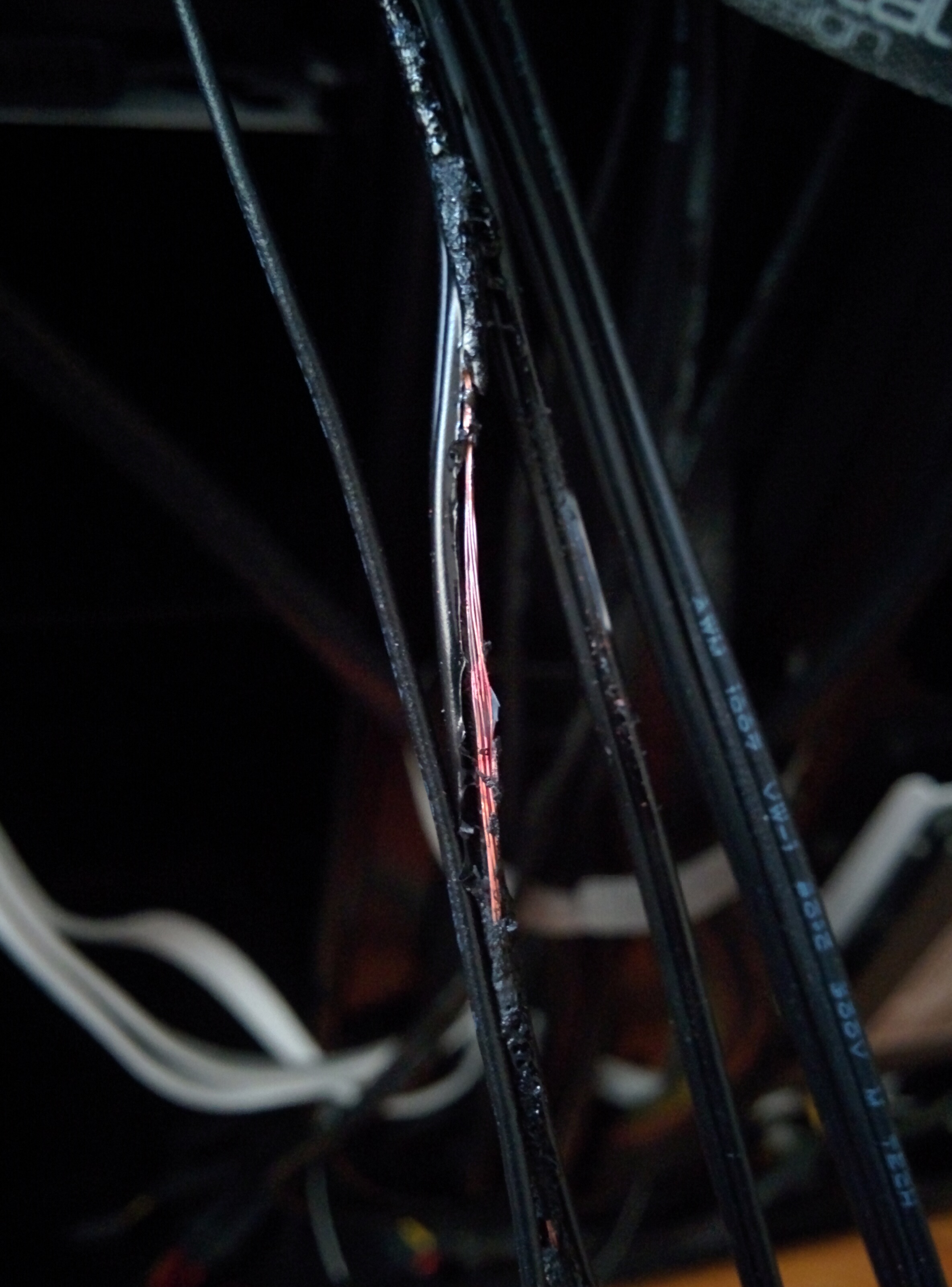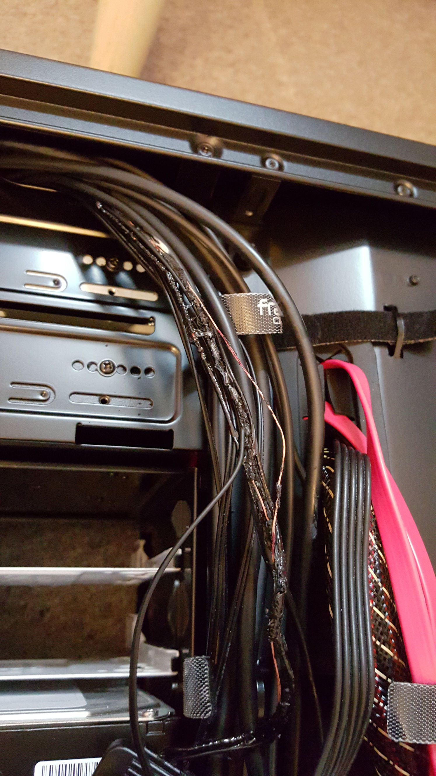 Nachdem ich getestet hatte das alles einwandfrei arbeitete, wollte ich noch die Lüfter von "Maximum" wieder auf die niedrigste Einstellung stellen. Nach ca. 15 bis 30 Sekunden kam eine dicke Qualmwolke hinten aus dem PC, begleitet von beissendem Kunststoffgestank. Ich schaltete das Gerät dann sofort aus und entfernte alle Kabel. Beim Öffnen der Seitenteile stellte ich fest, dass die Kabel, die von der Lüftersteuerung zum SATA Stromanschluss gehen, mehr oder weniger zu einem Klumpen zusammen geschmort waren (siehe Bildanhang).