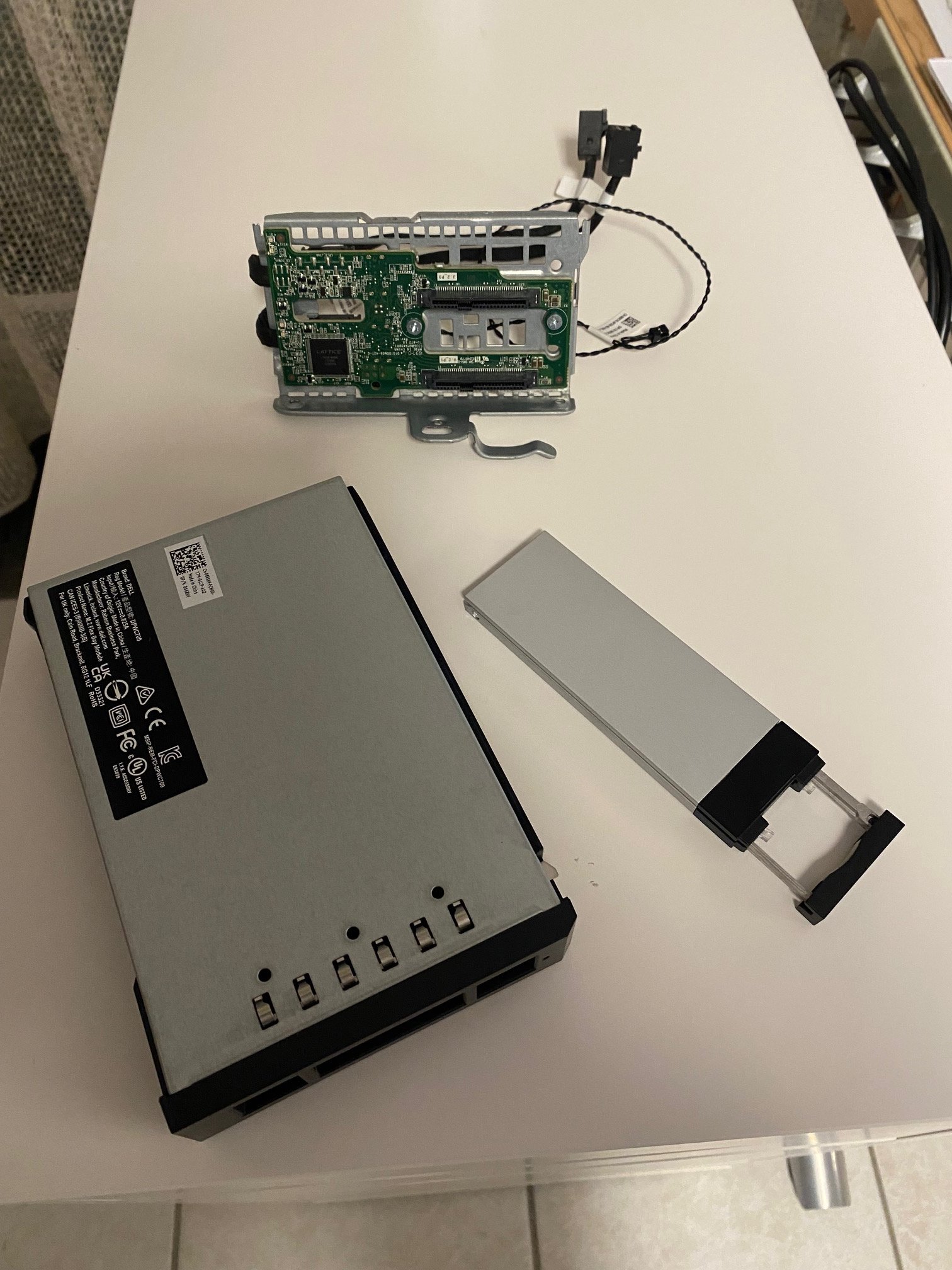 ja mein Rechner hat ausgelaufene Service-TAG Nummer und daher ist Dell Support für mich nicht erreichbar (nicht über email und über Telefon, da bin ich skeptisch...). Der Rechner wurde initial nicht mit Windows11 ausgeliefert. So wie ich es sehe, ist eine Installation einer M.2 SSD als Bootdrive für mich bei diesem Rechner nur über die Installation der o.g. Hardware (siehe beiliegendes Bild). Die "Backplane" (Siehe 1600.jpg) wird anstelle einer SATA Backplane in den Rechner eingebaut und auf dem Mainboard sind entsprechende miniSAS Stecker für die Kabel von der Backplane. Zu meiner Verwunderung konnte ich aber in den Dell Unterlagen bisher keine eindeutige Antwort auf meine Frage nach dem Passenden Treiber gefunden. Ohne den Treiber wird die M.2 SSD bei der Windows11 Installation nicht erkannt, das habe ich bereits probiert.
