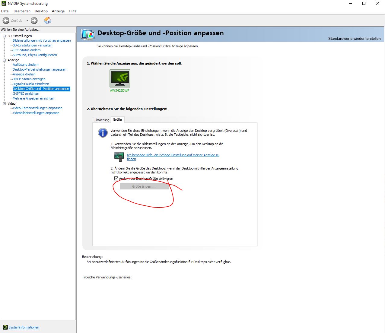Wenn ich bei Nvidia die Größe Manuell einstellen will, funktioniert es nicht.