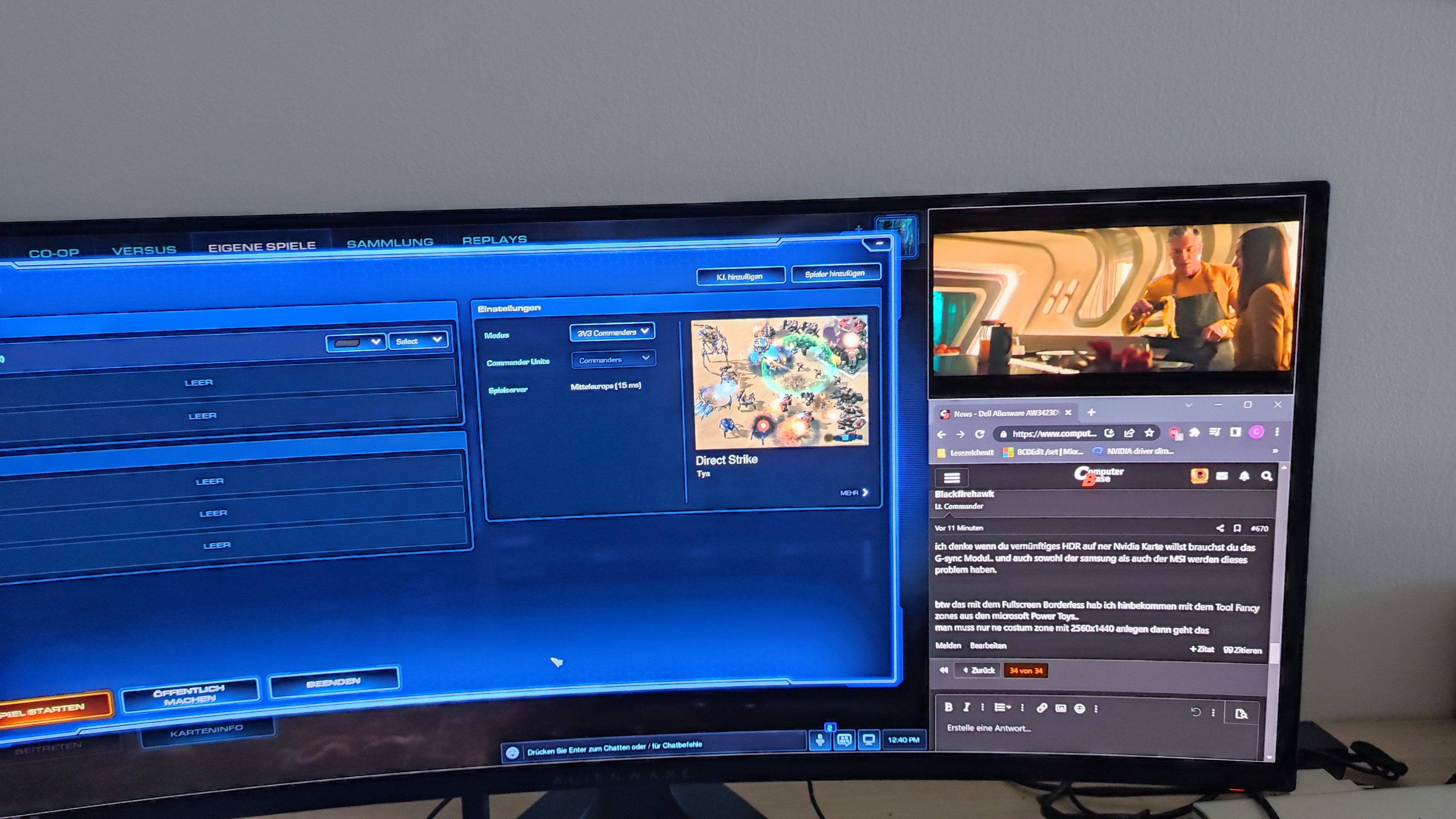 Hast du schon mit dem PIP/PBP Mode im OSD rumprobiert? Mit dem Windows PowerToys Tool kann man seinen Bildschirm auf Bereiche aufteilen, aber Spiele gehen da wohl nur im Fenster-Modus mit dem hässlichen Rahmen.