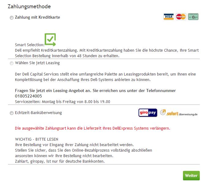 ich melde mich heute mal, weil ich eben mal eure Meinung hören wollte. Gibt es bei DELL keine Möglichkeiten mehr die Rechner auf altbewerte Methoden zu zahle, sprich Vorkasse, Rechnung, Überweisung, etc.? Aktuell gibt es ja anscheinend nur noch GiroPay/Sofortüberweisung und Kreditkarte.