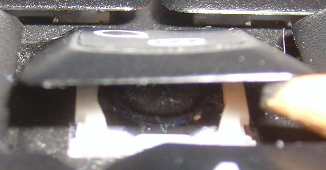 Ok, ich habe versucht, sie reinzudrücken. Das Ergebnis ist, dass jetzt die andere Seite auch lose ist und die Taste nur noch an einem Scharnier befestigt ist, dass sich in der Mitte ihrer Unterseite befindet. Ich mache mal ein Foto, wenn die Batterien wieder voll sind.