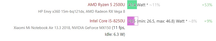 Hier muss man aber noch anmerken, dass die Verbrauchswerte vom HP Envy stammen, wo der 2500U mit 25W ausgelegt wurde, das macht laut Notebookcheck zumindest im 3DMArk +11% aus(Acer Swift vs. HP Envy).