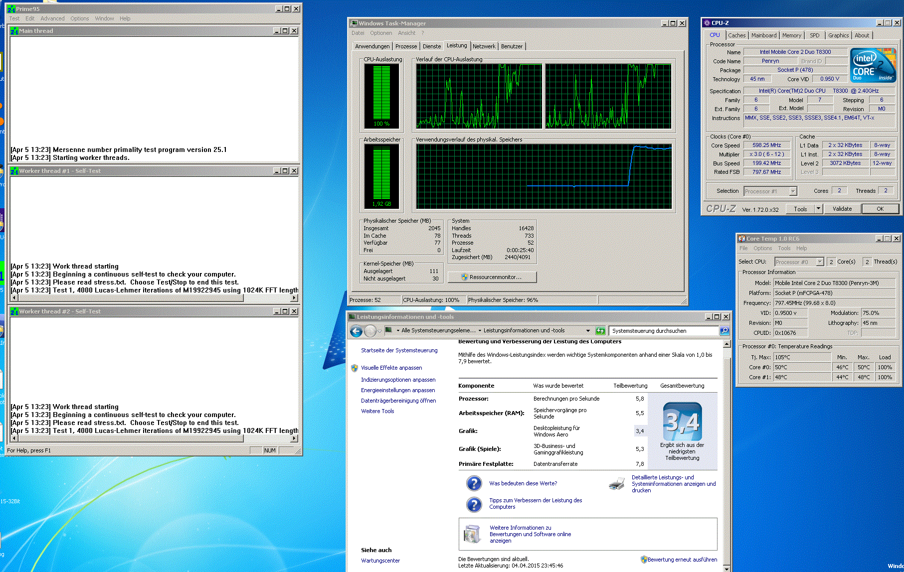 Das NB besitzt einen Core2Duo Intel T8300 (FSB800, 3MB, 2,4GHz), 2GB Ram, Quadro FX360m Graka. Installiert ist Win7Pro x86, alle Treiber wurden problemlos bei der Installation von Windows erkannt, ich habe nichts nachinstalliert.