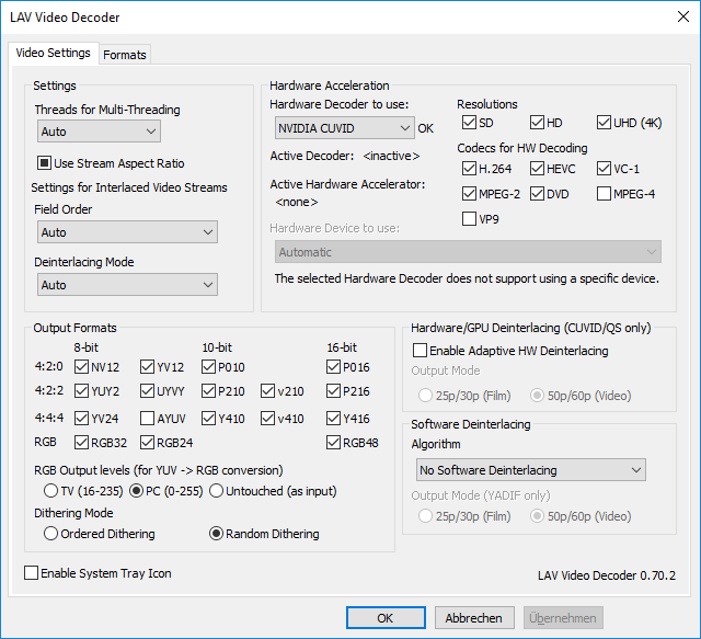 Im LAV-Video-Decoder ist NVIDIA CUVID aktiviert, aber der Beschleuniger ist <inactive>. (siehe Anhang)