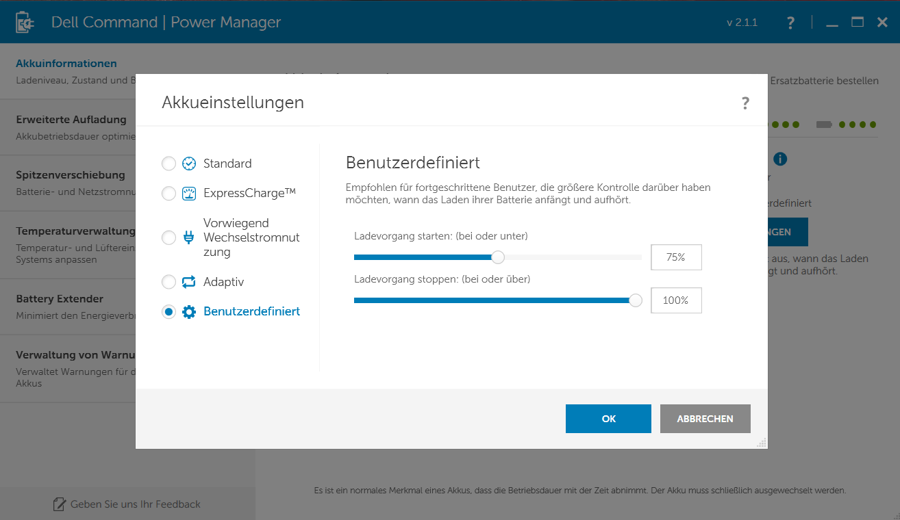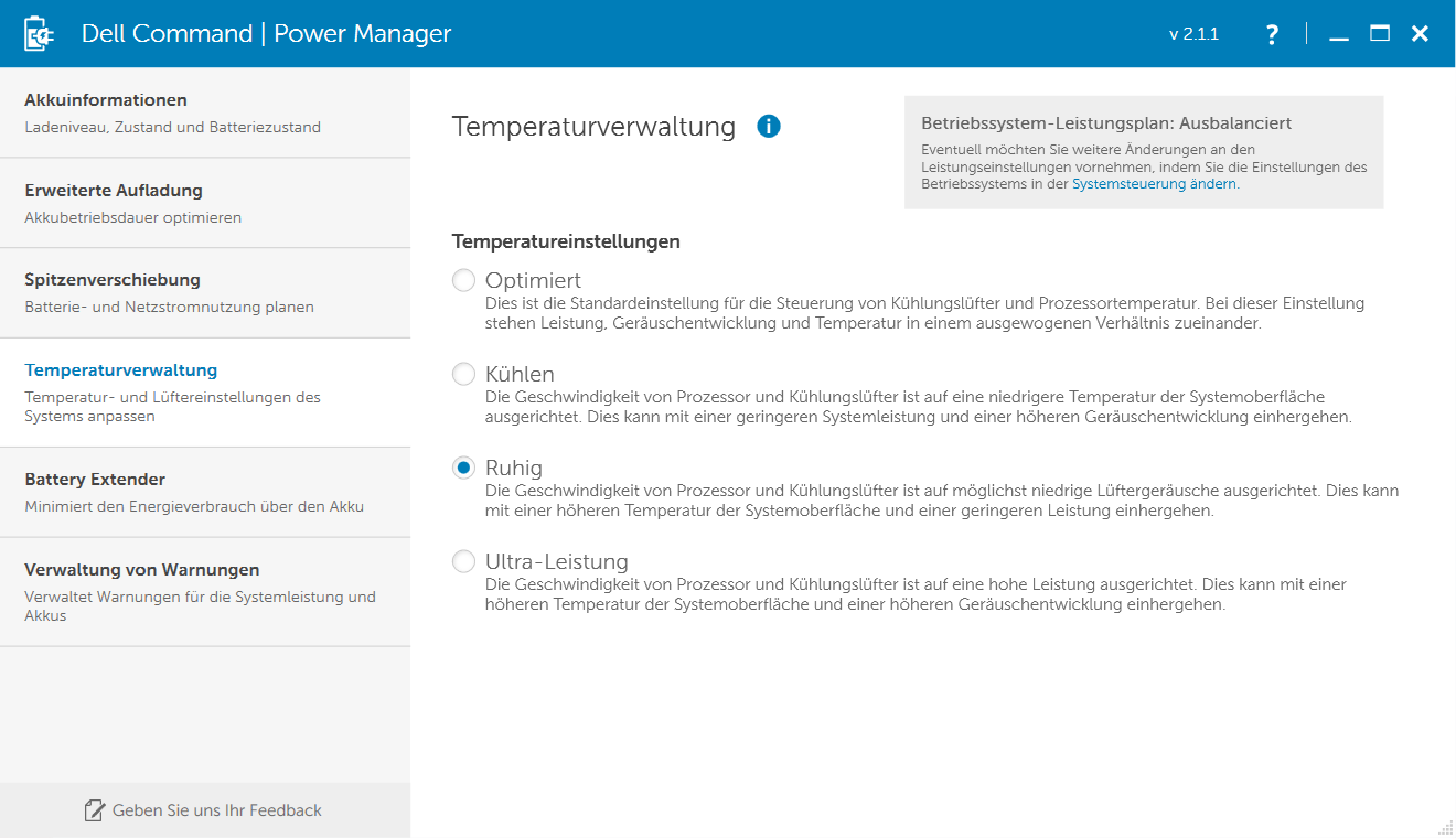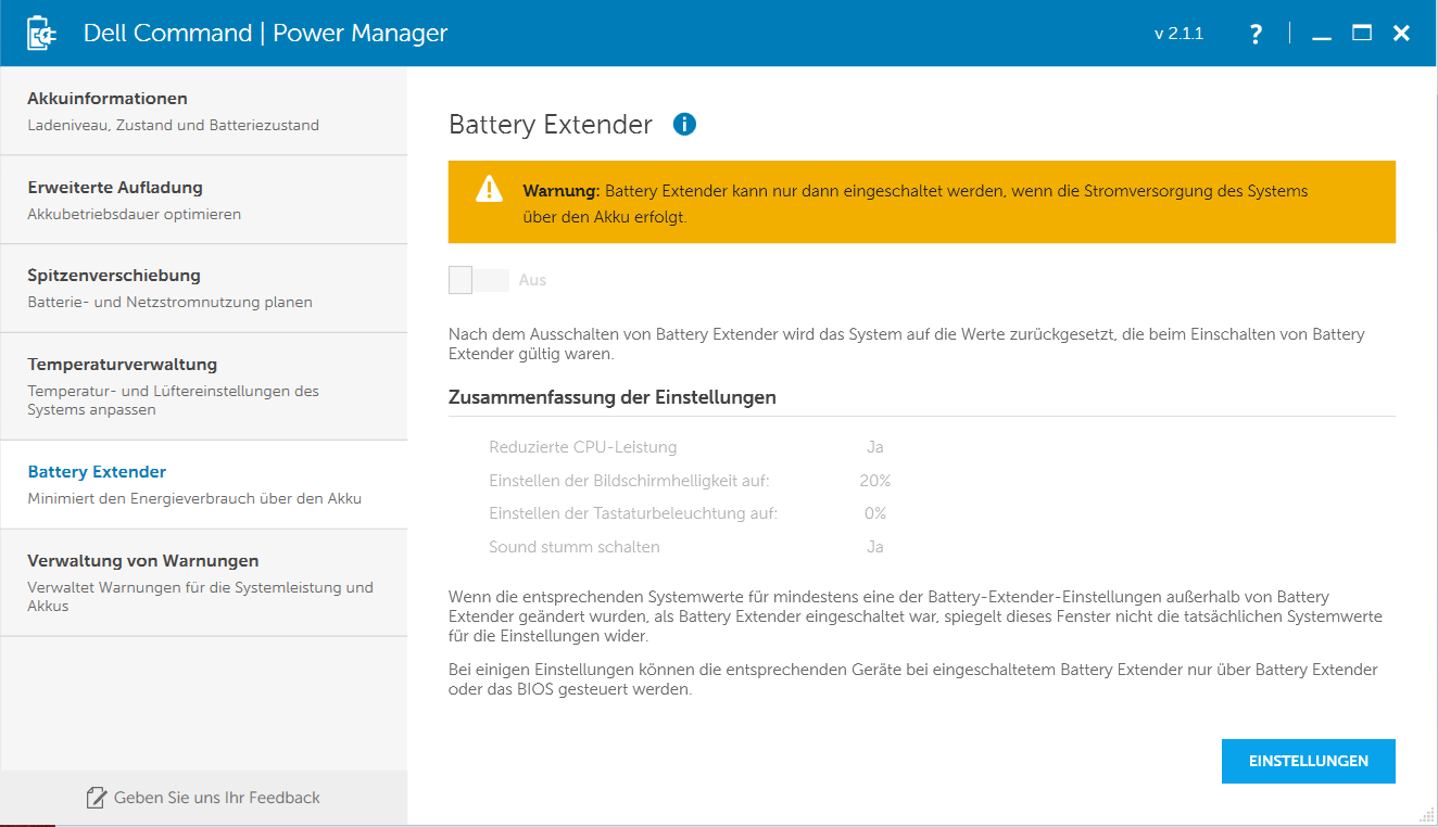 'Akkuinformationen und Ladeverhalten des Akku', die 'Temperaturverwaltung' und der 'Battery Extender' sind hierbei in meinen Augen die interessantesten Optionen. Daneben gibt es noch die Kategorien 'Erweiterte Aufladung', 'Spitzenverschiebung' und 'Verwaltung von Warnungen'.