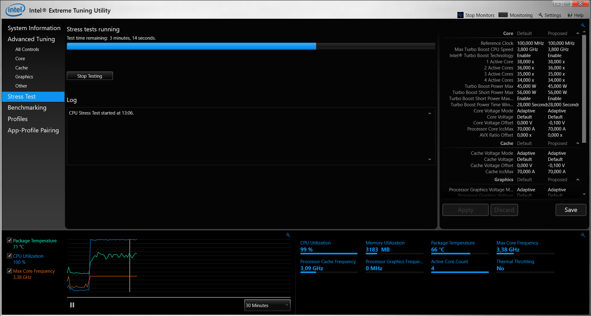 Im Idle hat das CPU-Package eine Temperatur von ~35°C, die Lüfter stehen still. Bei CPU-Volllast (8 Threads) hat das Package eine Temperatur von ~70°C bei konstanten 3,4GHz, beide Lüfter drehen mit 2500 RPM - subjektiv ist dies leise.