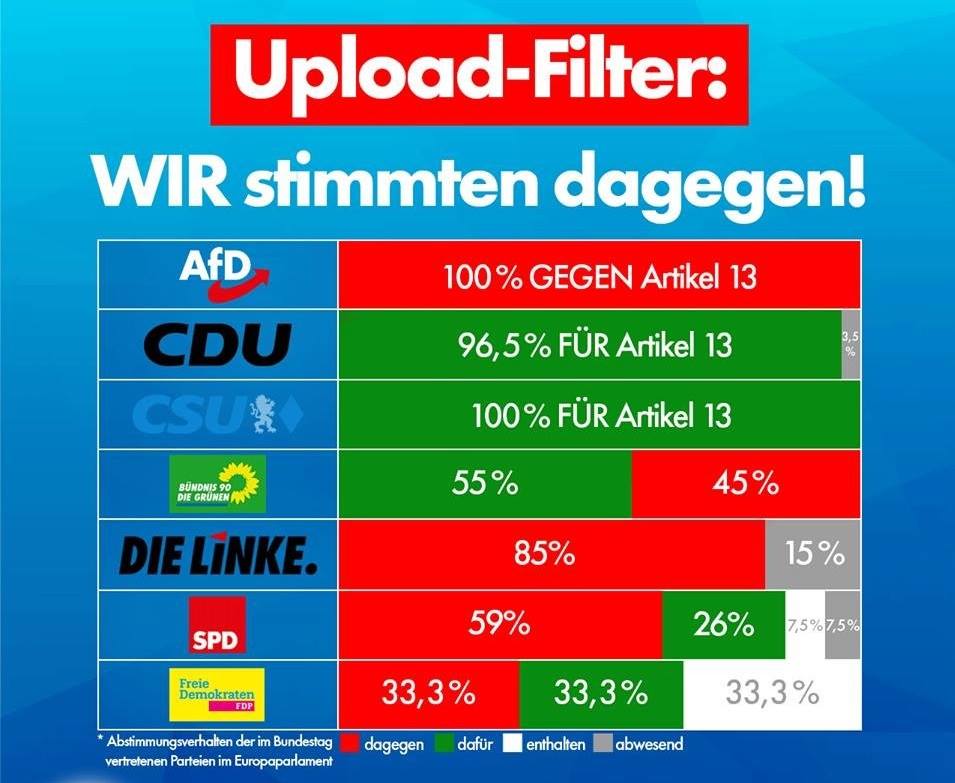Ansonsten ist doch gerade die AfD immer die erste Partei, die nach Zensur schreit, wenn mal wieder Fakten berichtet werden, die der AfD nicht passen, und die stattdessen lieber rechtsesotherische Verschwörungsblätter propagiert. AfD wählen um gegen Zensur zu sein ist so wirksam wie sich die Zähne mit dem Hammer rauszuprügeln, um keine Zahnschmerzen bekommen zu können.