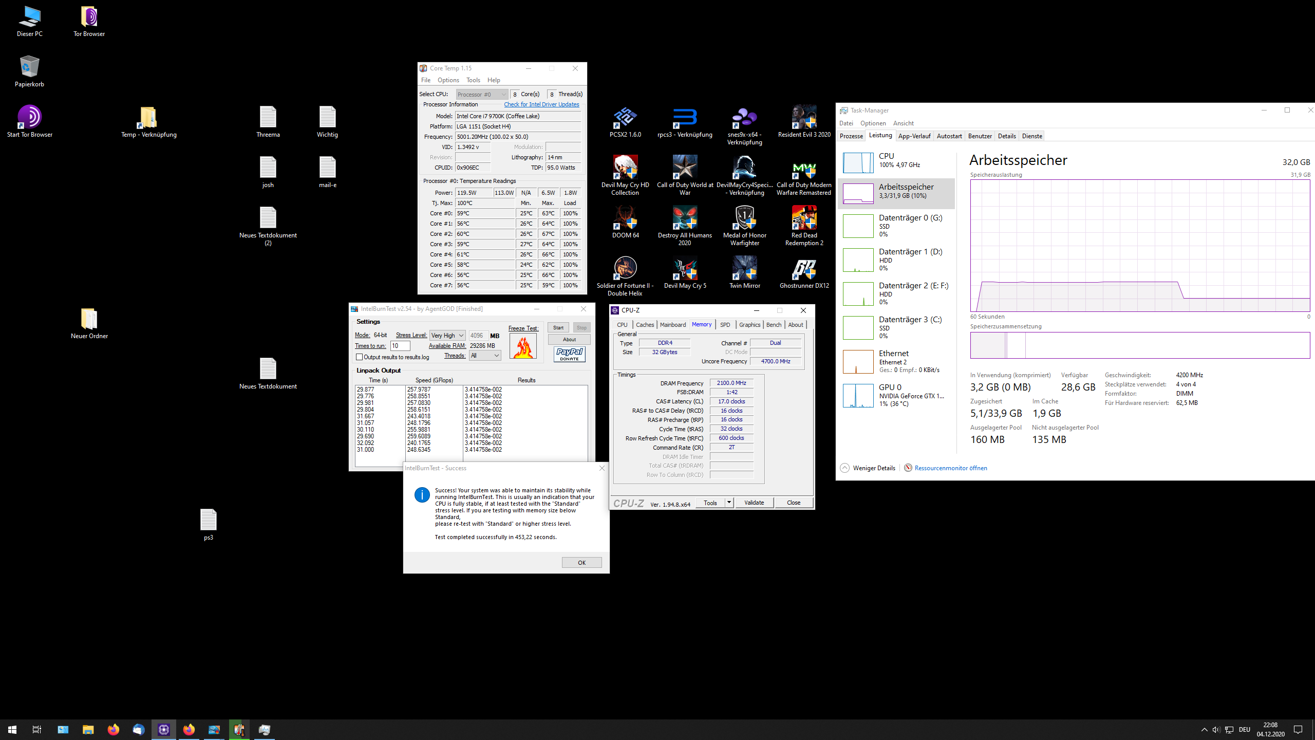 Mein alter 7700k schafft dieses Gammeltool (Intel Burn Test) auch mit 5,0 Ghz, das hat aber absolut nichts mit dem zu tun was bei realen Anwendungsszenarien passiert, Beispiel: Zocken.