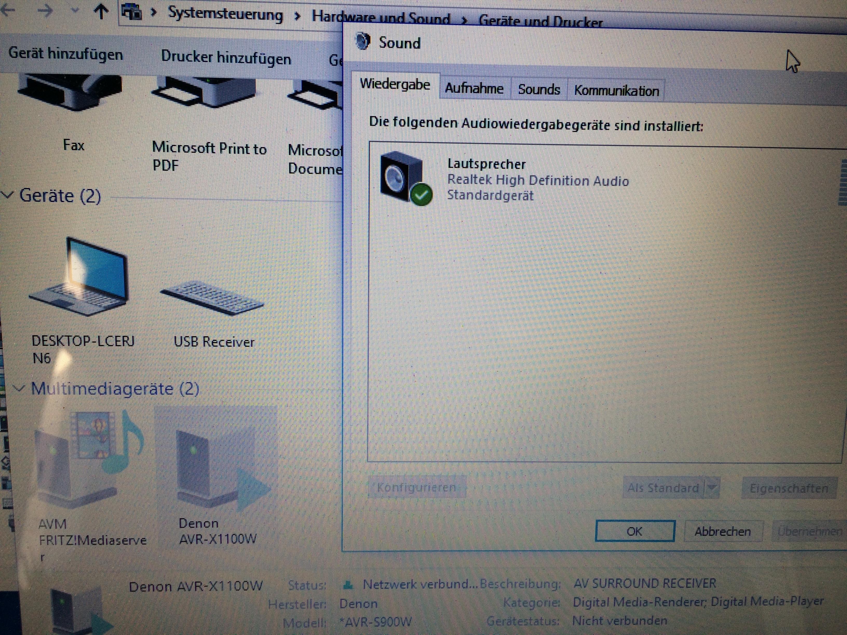 hmm also bei Geräte und Drucker steht der Denon drin als Netzwerk verbunden, aber bei Gerätestatus Nicht verbunden und bei Sound ist auch nur der interne. Keine Ahnung wie ich jetzt auf den Denon zugreifen kann.