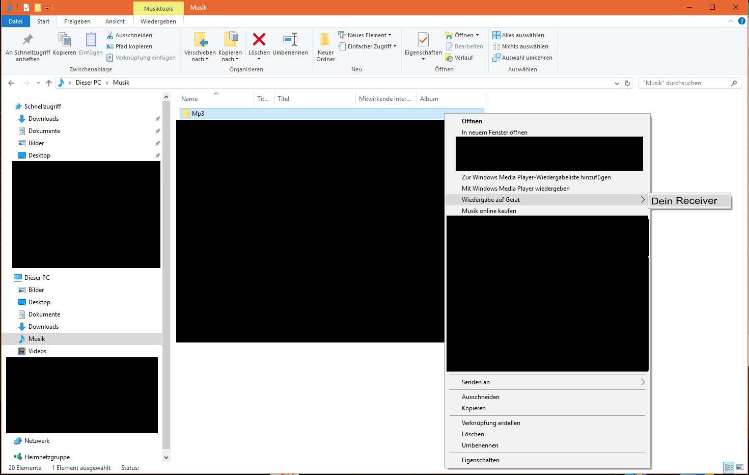 Mit einem Yamaha gehe ich folgendermaßen vor: Musiktitel markieren, rechte Maustaste und "Wiedergabe auf Gerät -> "Receivername""