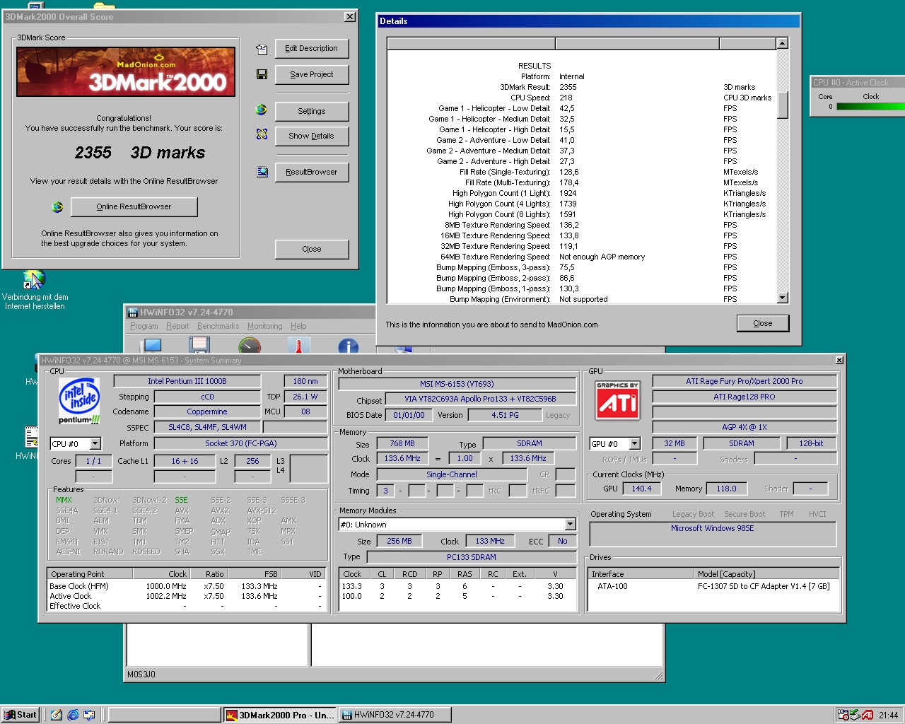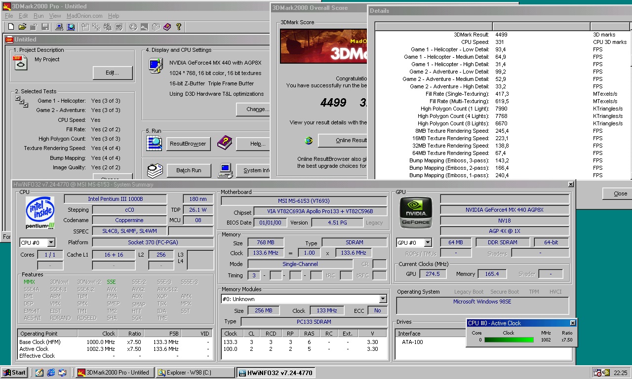 Zum Abschluss noch die TNT2 Pro @ Stock - natürlich hat sich das Sockel A-Mainboard an meine Abneigung gegenüber Sockel A-Plattformen erinnert und erstmal rumgezickt: Nach dem gefühlten 10. Neustart hat es dann heimlich den CPU-Takt zurück gestellt, sodass hier 100 MHz weniger anliegen - ich hab jetzt aber auch keine Lust das nochmal nachzutesten