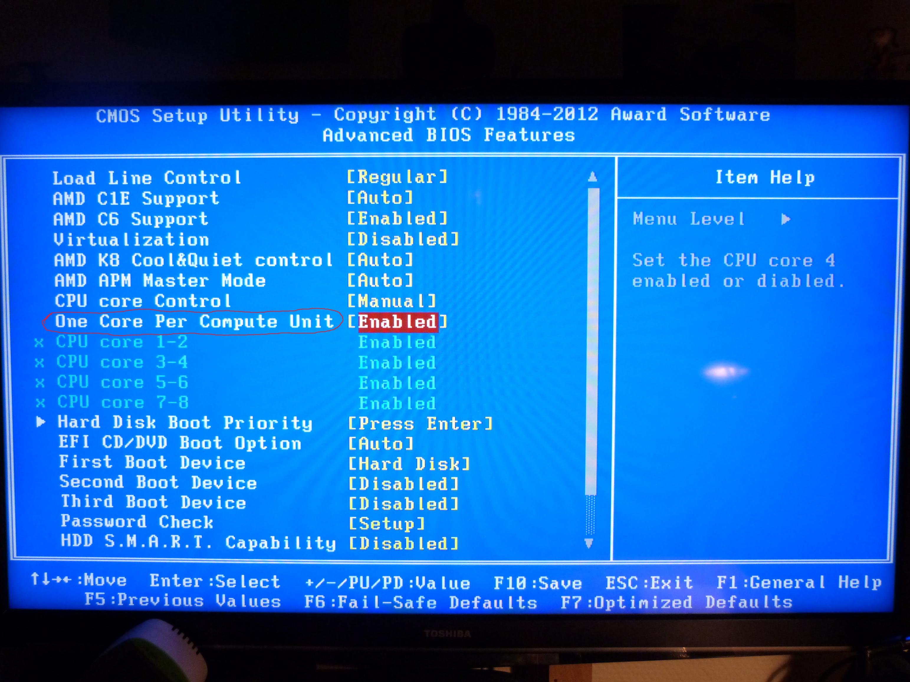 Die anderen Core alle Aktiviert lassen,so das das Bios aus Jedem Modul ein Core abschalten kann.