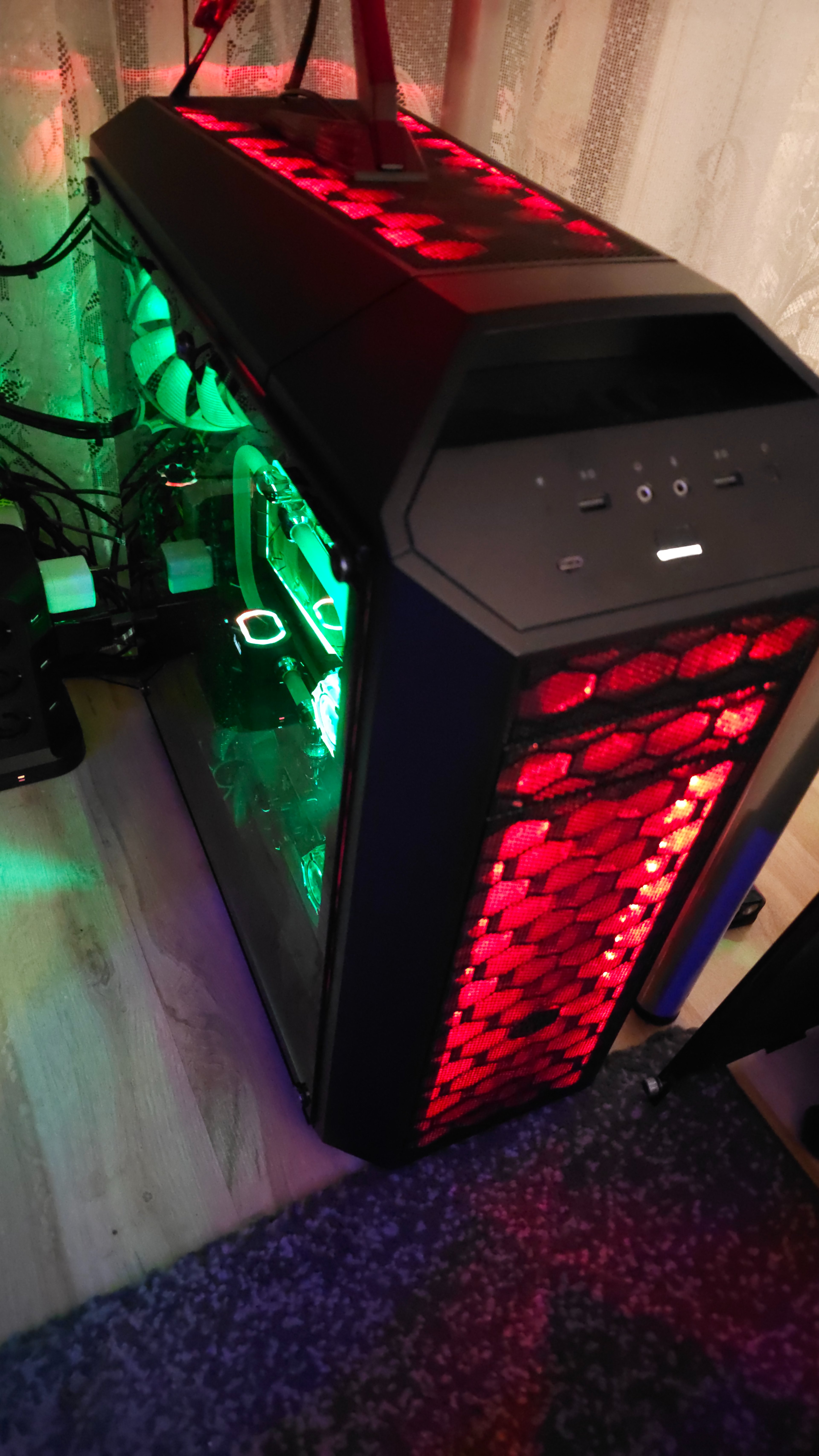 Habe ja zwei RGB-Strips oben drin und unten noch einen hinter der Grafikkarte. Dadurch wird alles zusätzlich etwas mit ausgeleuchtet. Ich mag es lieber etwas dezenter und nicht stark ausgeleuchtet. Mit der getönten Scheibe wird die Beleuchtung auch schön dezent dargestellt. Das Bild ist hierzu stärker ausgeleuchtet. Bekommt man leider auf Bilder mit einer Handykamera nicht besser hin und auch nicht so hin, wie es tatsächlich aussieht.