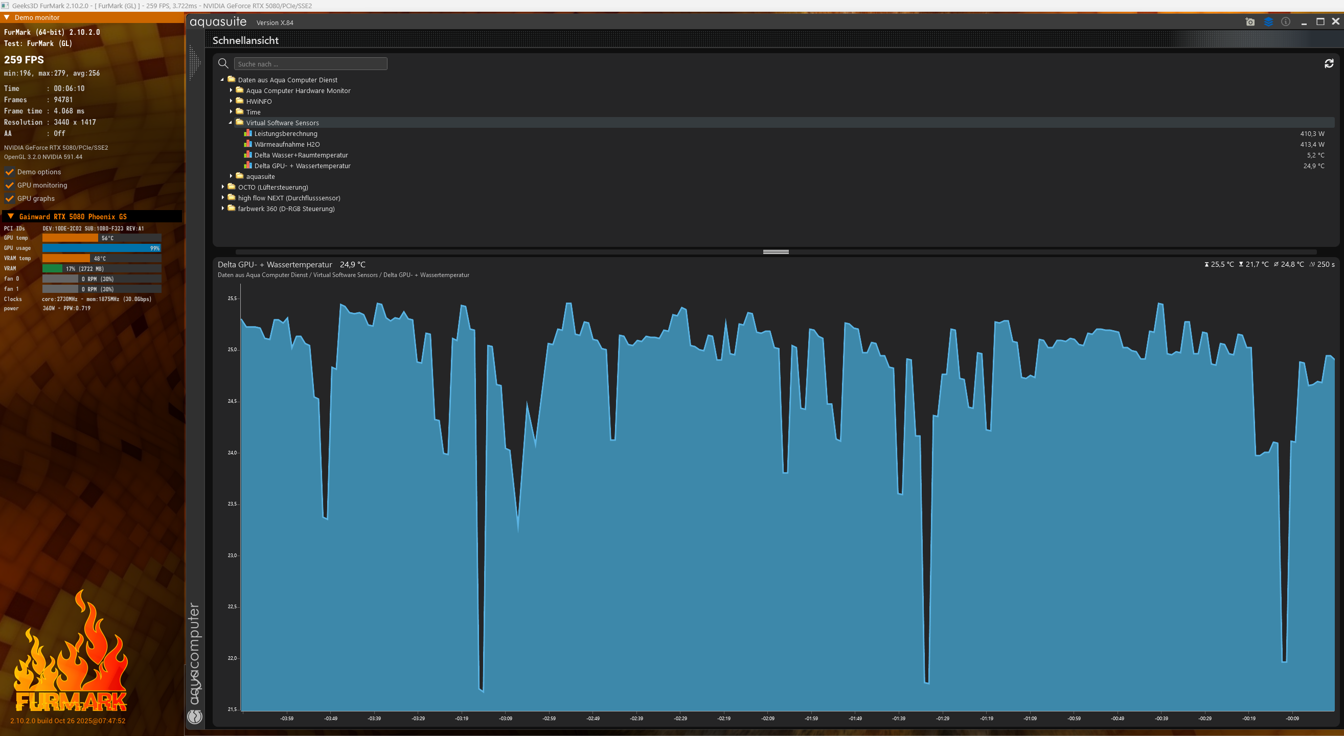 Die GPU-Temperatur wird aus HWInfo entnommen, denn die Aquasuite scheint diese mit der RTX 5080 nicht 100 % korrekt auszulesen. Die Wassertemperatur kommt vom Mora und geht direkt zur Grafikkarte.