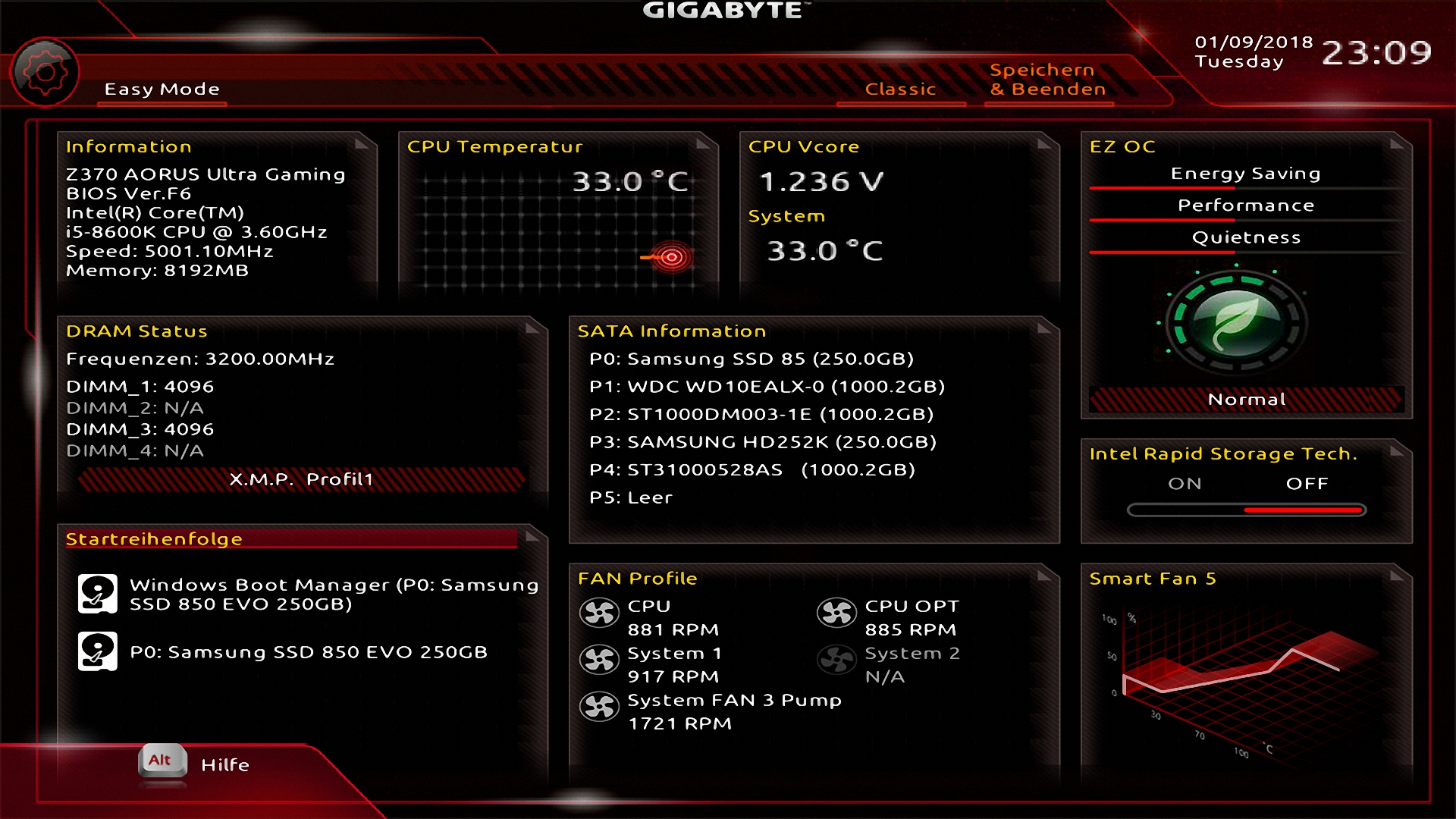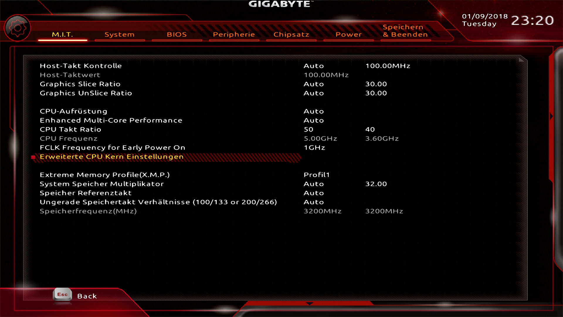 Hier mal meine Einstellungen von meinem Gigabyte MB bezüglich des OC auf 5,0 GHz / 1,220V mit LLC auf High, was dann unter Windows bei meinem i5 8600K in 5,0 GHz / 1,236V mündet.