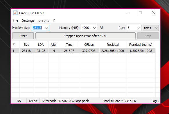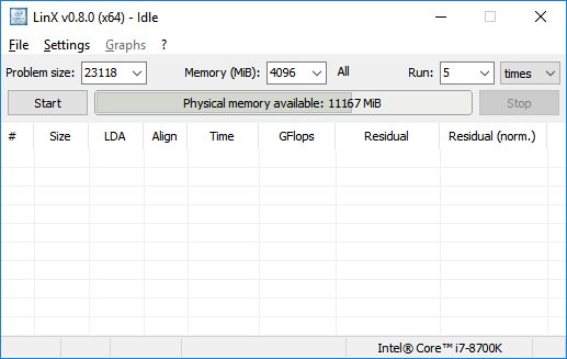 LinX v0.8.0 findet man ja mit google. Gibt eine neuere Version aber die ist in Koreanisch. Ja LinX v0.8.0 nutzt AVX. Man startet das, dann stellt man ein wieviel Ram man nutzen will und drückt Start. Neben LinX sollte man nichts anderes machen wie surfen, weil die CPU wirklich volle Lotte genutzt wird.