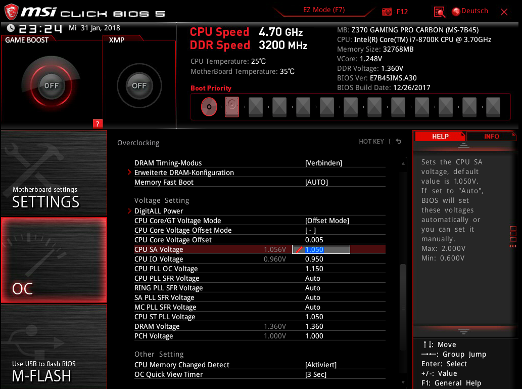 Deine Nebenspannungen sind alle auf Auto. Deine CPU-SA Voltage ist mit 1,312 V zu hoch. Das liegt daran dass Du das XMP-Profil aktiviert hast. Dann knallt das Board vor allem CPU-IO und CPU-SA viel zu hoch, was auch unnötig ist.