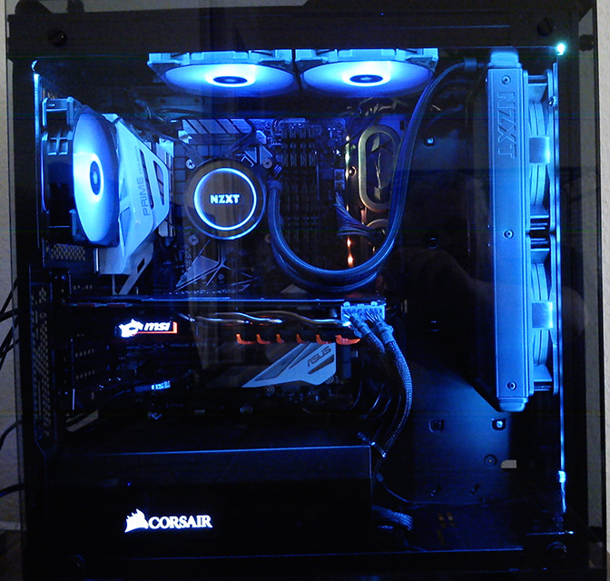 Vorne 20cm-Lüfter via Lüftersteuerung auf niedrigster Einstellung. Die Grafikkarte ist aber 3,5 Slots dick und verdeckt den Chipsatzkühler fast komplett. Wird von den Grafikkartenlüftern auch noch mit angepustet.