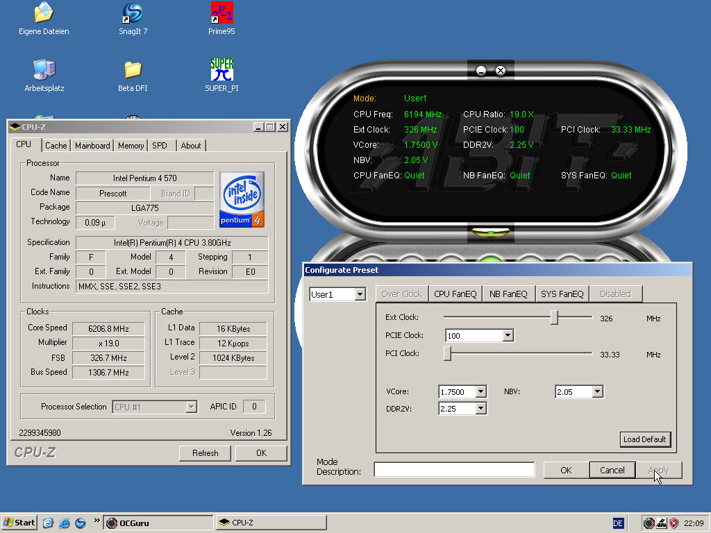 Kommt jetzt ein Flüssigstickstoff-Kühler auf die Northbridge. Im BIOS gibts leider keine Möglichkeit einen Teiler wie 3:2 auszuwählen, nur 2:3.