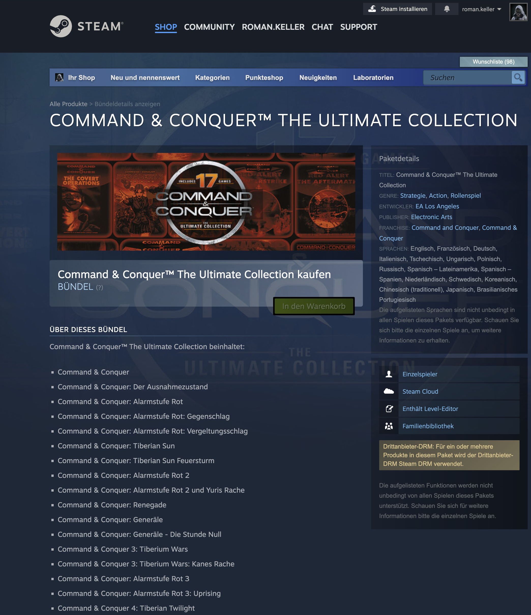 Mittlerweile ist die Collection wieder in der Schweiz abrufbar: https://store.steampowered.com/bundle/39394/Command__Conquer_The_Ultimate_Collection/-Stealth- schrieb:... wenn man ein Game aus der Collection sucht und auswählt,