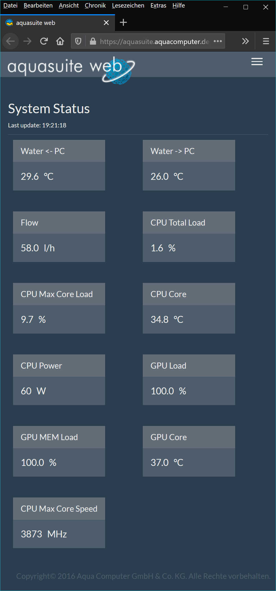 Ebenfalls praktisch ist die „Aqua Suite Web“ Funktion, um gewünschte Daten online anbinden zu können. So sieht man auch im Bett, unterwegs und von überall, was die Wasserkühlung und der Rest des PCs so machen: