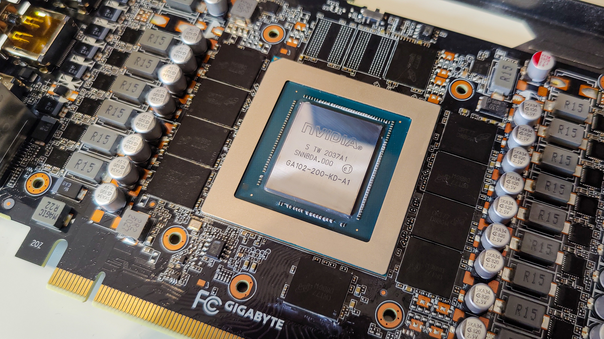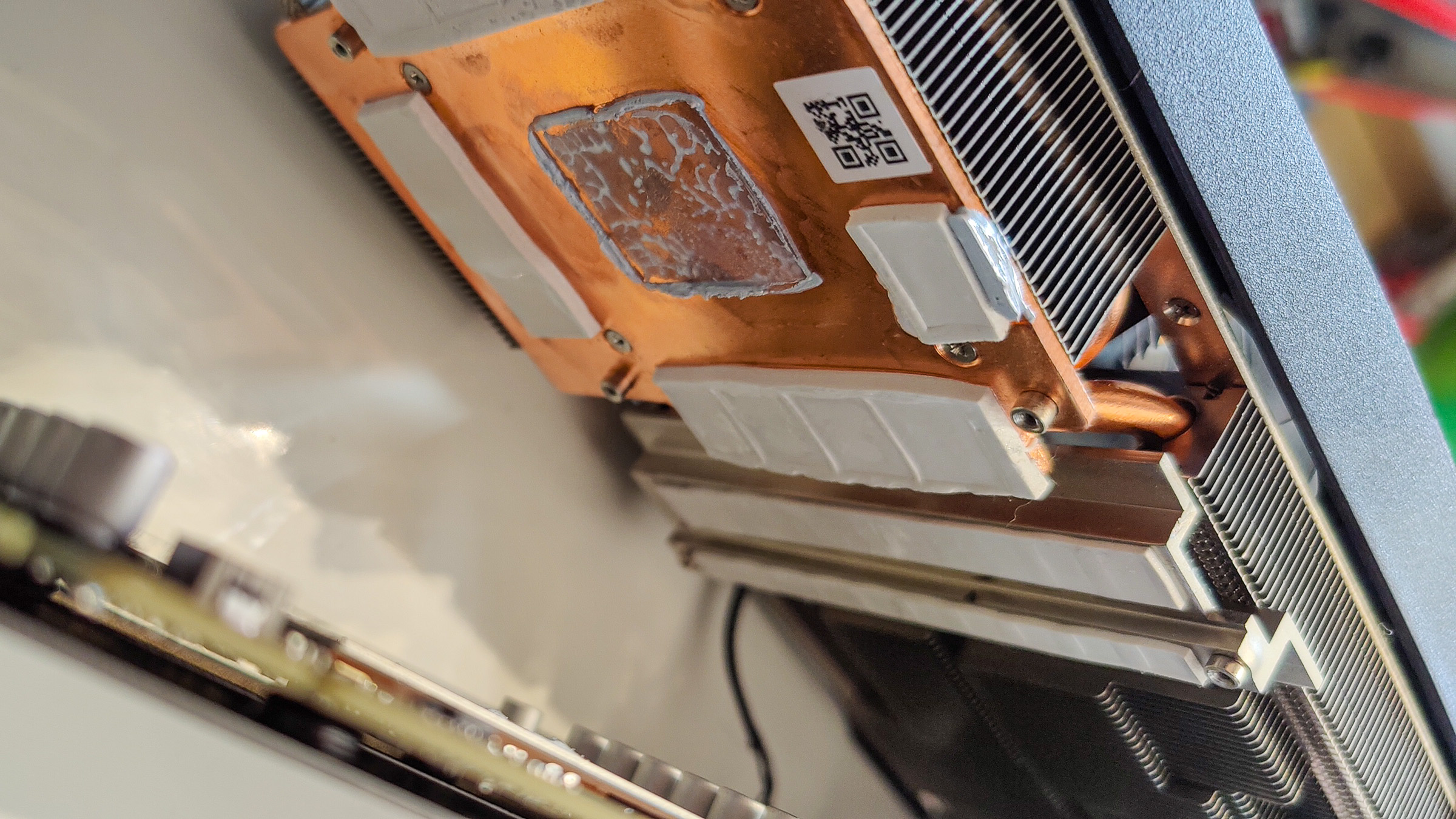 Und da stand ich nun... doch egal welche Luftkühlung ich auf die Komponenten ansetzte, meinen gewünschten Kompromiss aus "gibt keinen Ton von sich" und "nicht zu heiß" vermochte kein Setup so wirklich umzusetzen. Der NH-D15 auf der CPU macht per se einen passablen Job, aber dafür dass wir damals Winter hatten und die Zimmertemperatur weit von ihren Höchstständen entfernt ist... nicht wirklich zukunftstauglich. Und der Kühler der Gigabyte RTX 3080 Gaming OC 10G... ist... naja, nur auf den ersten Blick erträglich. Zwar lässt sich die Lüfterkurve im Afterburner derart regeln, dass die GPU bei Last unter 90°C bleibt und dabei, sofern man gerade zockt, nicht zu sehr negativ auffällt. Aber: throttlen tut sie trotzdem. Selbst bei nur 70°C. Warum? Die Antwort lautet: GDDR6X. Der Speicher auf der RTX 3080 wird heiß. Sehr heiß. Und throttled ab 110°C. Und sobald man die Lüfterkurve anpasst, damit die GPU mehr Wärme-Spielraum bekommt aber dafür das ganze leiser wird, reicht die Kühlleistung nicht mehr für den VRAM aus, der dann regelmäßig auf die 110°C steigt und dadurch ein rapides absinken der Framerate und "Mikroruckler" verursacht. Ein Blick auf die Platine verrät auch, warum das wohl so ein Problem ist: einer der Chips ist zu gut einem Drittel weder von einem Wärmeleitpad noch vom Kühler direkt bedeckt. Ich habe kurz probiert, ob ich hier mit etwas Kryonaut das "Loch" füllen und so die Hotspot-Temperatur reduzieren könnte, doch dem war nicht so - vermutlich ist also sogar ein anderer Chip noch heißer, als der, der nicht mal korrekt gekühlt wird. Gibt ja auch schon einige Threads zum Austausch der Wärmeleitpads auf den RTX 3080ern...