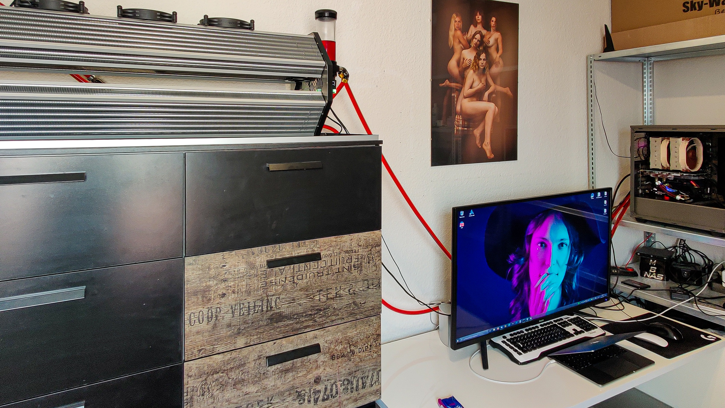 Bis zum jetzigen Zeitpunkt habe ich einzelne Komponenten getestet, bzw. das Verhalten bei Befüllung und Entlüftung. Aber wie genau ich das Setup bei mir installieren würde, war nur eine grobe Idee. Links hinter dem Monitor, da war eine große freie Fläche - dort hätte ich den Giganten hingestellt, und innen hinein die Pumpe mit AGB. Ich stellte das System probe, doch es gefiel mir nicht. Zu grob, zu massiv, und letztlich auch irgendwie suboptimal was die Kühlung anging, wenn ich auf Lüfter verzichten wollte. Die natürliche Konvektion am Radiator wäre in dieser Position eher behindert worden.