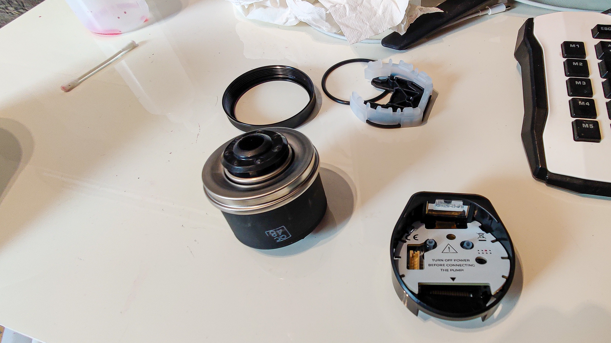 Rechner wieder aus, Wasser aus dem AGB abgelassen, Pumpe erneut abgeschraubt. Noch mal gereinigt. Alle Schritte von vorn, mit noch mehr Augenmerk auf die Kabel und eventuelle Rest-Feuchtigkeit an den Knopf-Kontakten. Wieder getrocknet und erneut probiert. Das Display flackerte nicht mehr. Die Knöpfe drückten sich aber immer noch wie wild von selbst. Außerdem meldete die Pumpe nun „geringe Pumpendrehzahl“ und klang, als ob sie trocken laufen würde (obwohl sie ein gutes Stück Wasser zum spielen hatte). Und per USB wurde sie noch immer nicht erkannt.