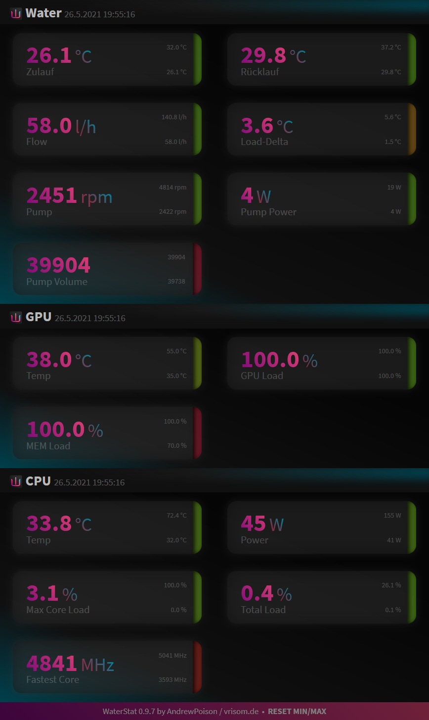 | GPU Power | Wasser | GPU | GPU Hotspot | VRAM | Raum |