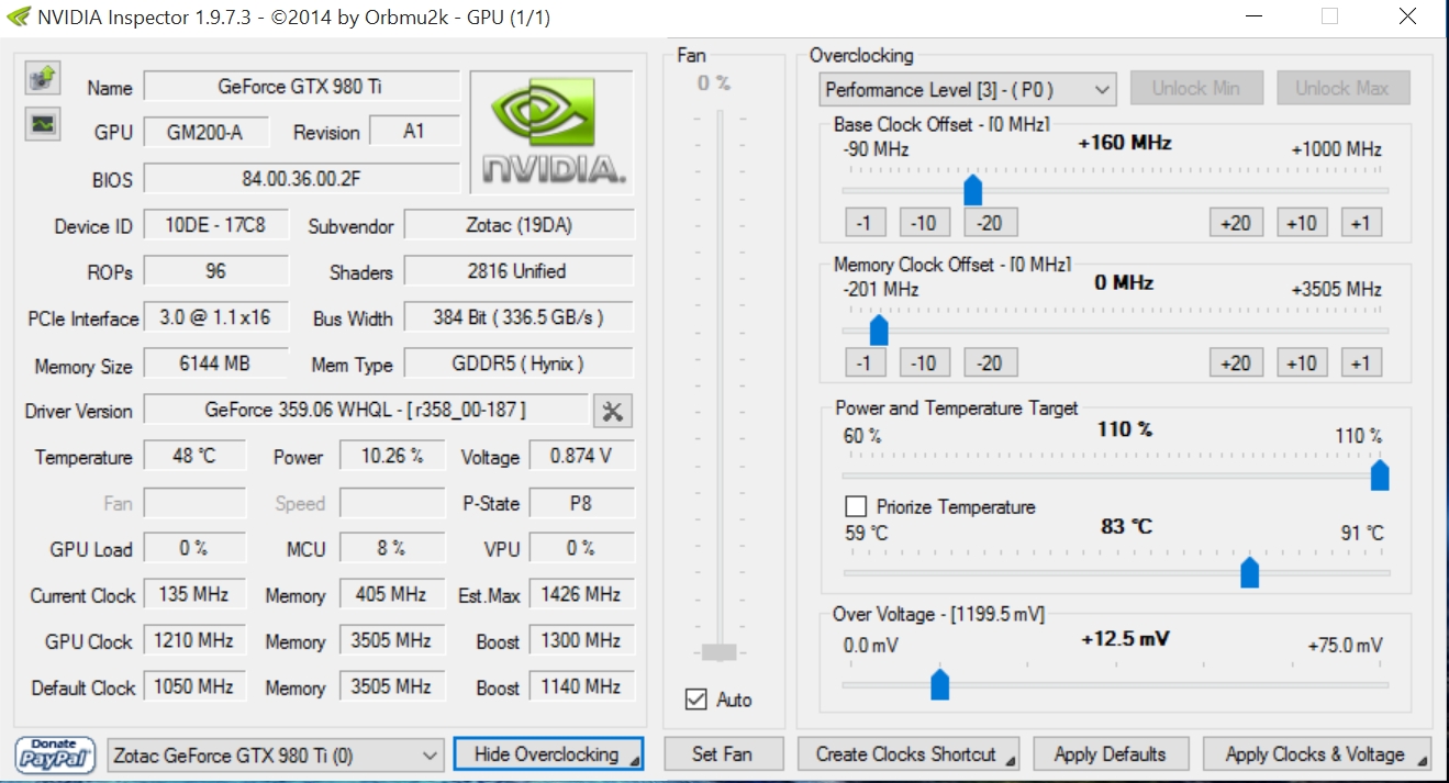 Minecraft läuft im Hintergrund mit Shader und 100MHz Offset und der Kühler zeigt wieder, dass er auf einer 700€-Karte keinerlei Berechtigung hat! 80°C und 59%/1980 1/min. TDP ist bei 97%. Ich hoffe, so ein Premium-Hersteller macht bei Pascal auch Premium-Kühler drauf. Ich bin von Inno-3D GTX780 und Gigabyte GTX980 Temperaturen unterhalb von 70°C gewohnt.