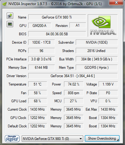 Nun hat sich mein Kollege eine 980Ti Waterforce von Gigabyte gekauft und die läuft mit manuell OC auf 1.560MHz ohne Spannung anzuheben. PT war glaube ich 130%.