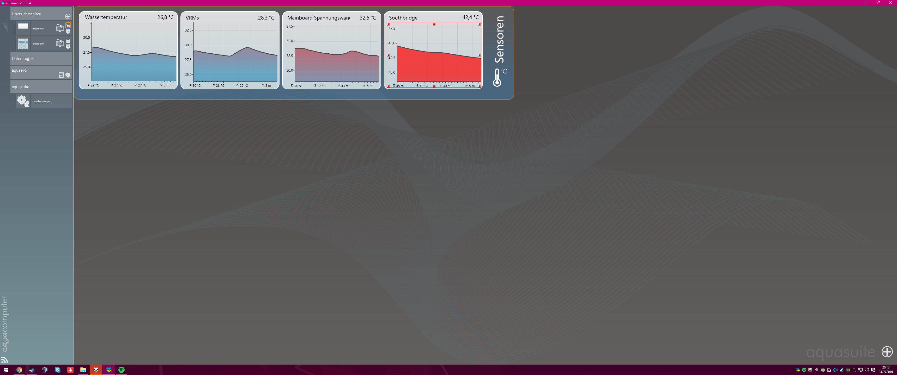 Ich habe Dir mal die aquaero5_default_page im zip-Format gepackt. Die nimmst Du und fügst sie in den Ordner aquasuite-data. Damit lässt sich viel besser und übersichtlicher arbeiten. Vor allem kannst Du mehr an Temperatur-Informationen des OC-Systems darstellen. Du musst ja nicht gleich den Voll-Kontroletti machen wie ich. Von den GrafKa-Temps. solltest Du beim OC jedoch die GPU, die VRMs die Oberfläche der Backplate und nach Möglichkeit noch die VRAMs auslesen lassen. Du kannst hierzu auch die von AIDA 64 und/oder HWInfo ausgelesenen Temperaturen im Aquaero anzeigen lassen, falls es Dir Dein real life erlaubt