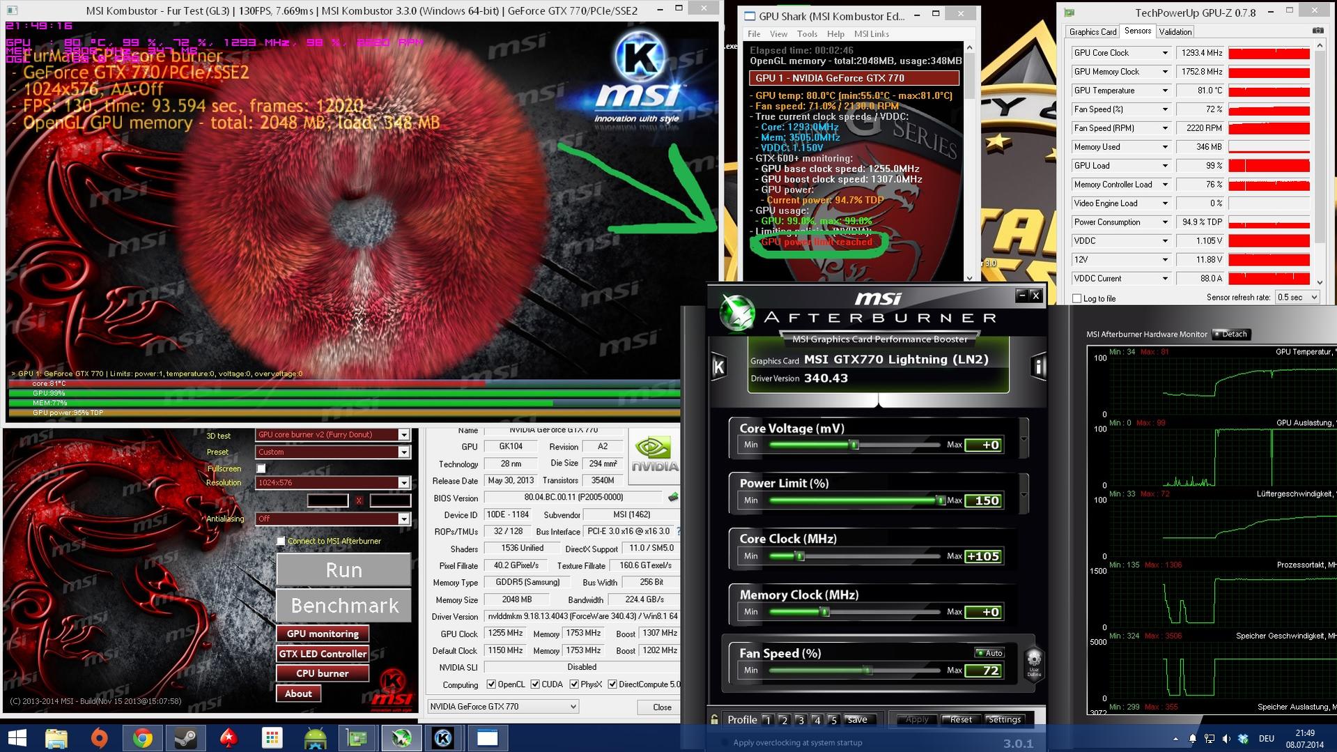 ich glaube du rennst ins temp limit bei 80C° und nicht ins power limit. zumindest zeigt gpu-z an das du das power limit nicht ausreitzt.