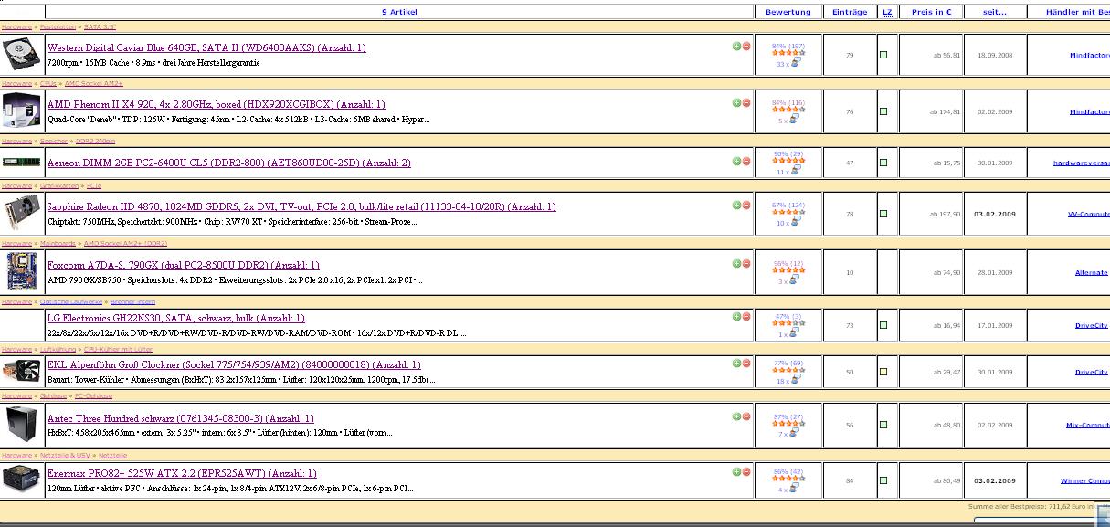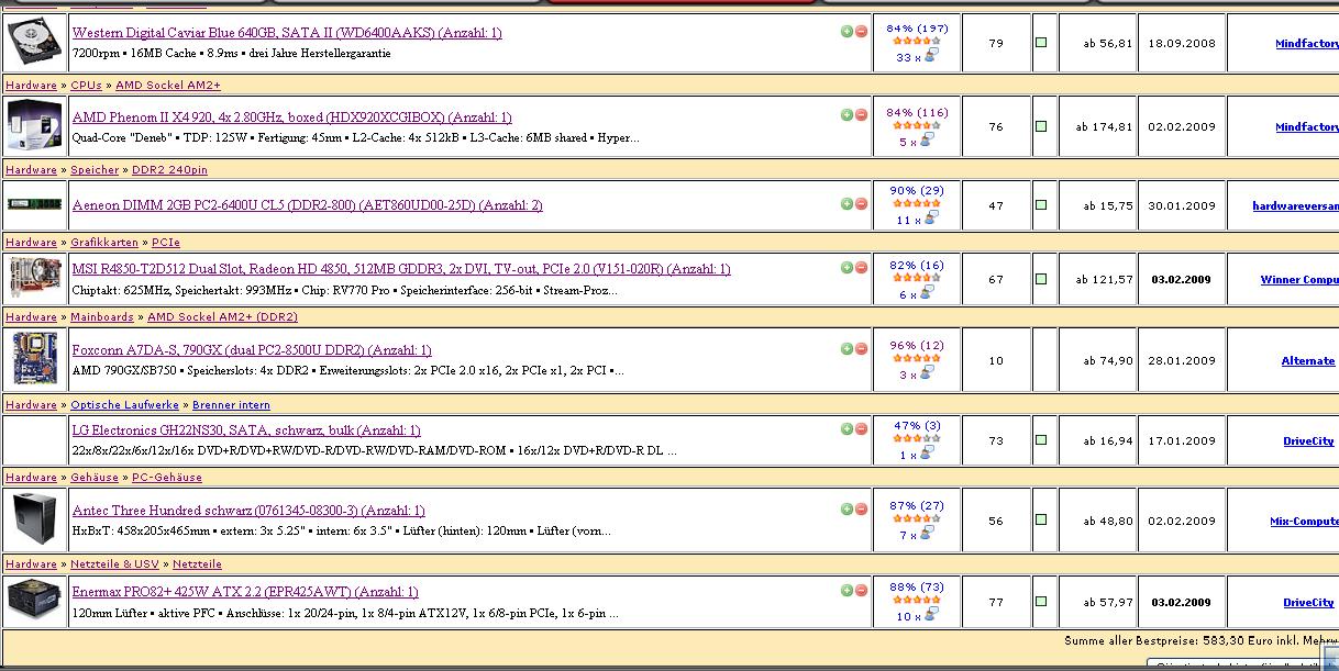 So, hab noch meine Zusammenstellung rangehängt, also es geht echt problemlos. Bestellen kann man bei 3 Anbietern, mindfactory hat kostenloses versenden ab 100€, und noch 20€ Versand macht den Kohl auch nicht fett. Beim 725€ PC könnte man auch den PII 940 nehmen, wär dann aber knapp drüber. NT müsste man evtl. noch klein bissl größer nehmen.
