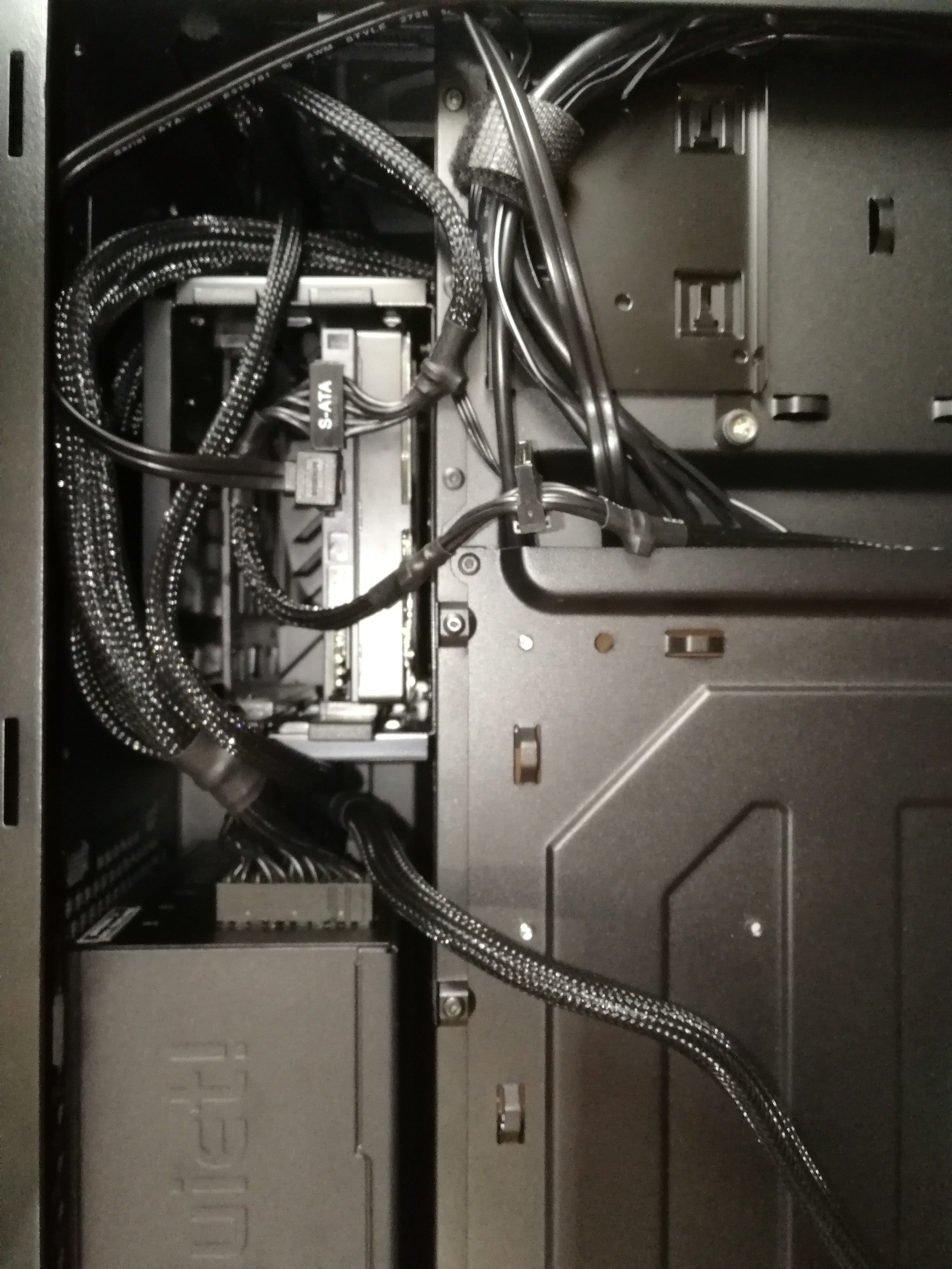 Sorry, dass ich das nochmal ausgrabe - aber damit hier auch mal die "Zielgruppe" (mein zweiter selbstgebauter PC, dieses Mal ohne Hilfe, ansonsten völlig unbeleckt was Hardware angeht) zu Wort kommt: Ich habe vor zwei Wochen einen Computer zusammengebastelt, im Wesentlichen nach den Empfehlungen hier, und habe ein be quiet! Straight Power 11 550W in den Sharkoon S25-V eingebaut (ich weiß - eine leicht andere Konfiguration, aber ich denke, sehr ähnlich, was das eigentlich Problem betrifft). Was mich tatsächlich mit am meisten Nerven gekostet hat, war, die Kabel des Netzteils in dem äußerst knappen Zwischenraum zwischen Netzteil und dem "Festplattenkäfig" unterzubringen, um 90° zu biegen und am Käfig vorbeizuführen. Also einfach fand ich das auf keinen Fall. Auch wäre es mit zwei Festplatten zwecks Verkabelung der Festplatten wirklich schwierig geworden bzw. ich hätte ein weiteres SATA-Netzkabel unterbringen müssen. Leider habe ich zugegebenermaßen auch erst zu spät gesehen, dass man den Käfig auch seitlich hätte verschieben können - da hatte ich aber das Mainboard bereits drin und wollte nicht nochmal alles ausbauen (und mit verbautem Mainboard kommt man nicht richtig an die Käfigschrauben dran). Kurzum - es geht, wie man auch auf meinem Foto sieht, aber leicht fand ich es nicht.