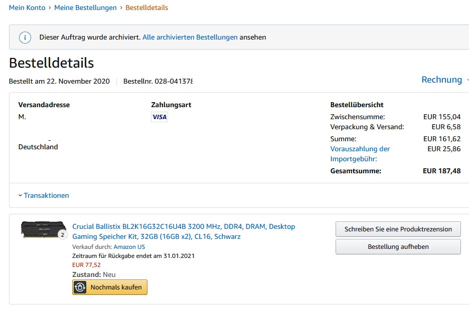 Welche hast du denn genau gekauft?RoccoMD schrieb:Jedoch sind RAM-Speicherriegel aktuell ziemlich weit oben im Preis, oder?