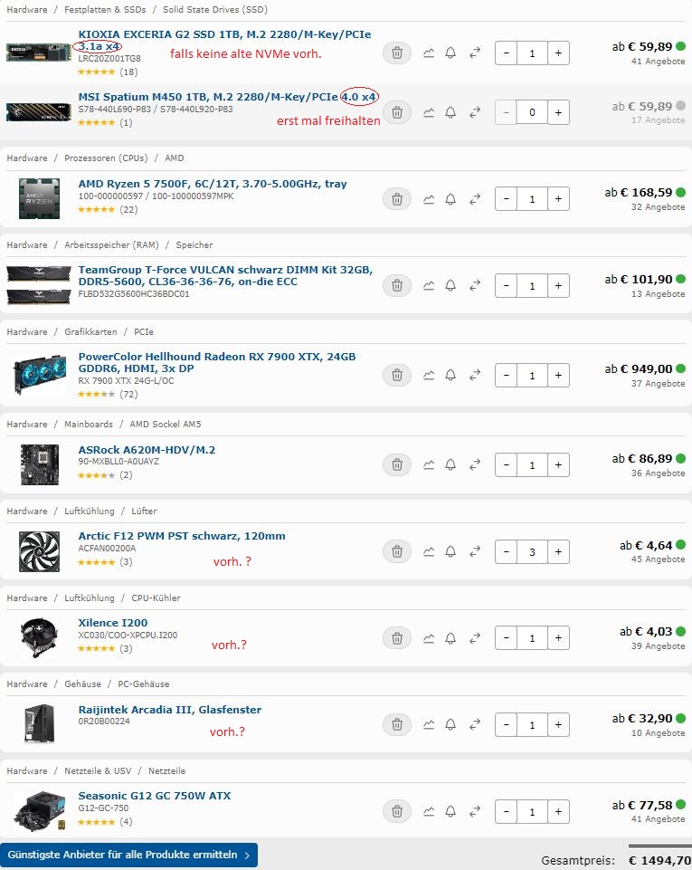 Bei der CPU downgraden wollen wir nicht zwingend aber je nach Preisentwicklung kann man die 7900XT bei den Alternativen mit hinein nehmen, wir schauen mal wie die Preise beim nächsten Update stehen.