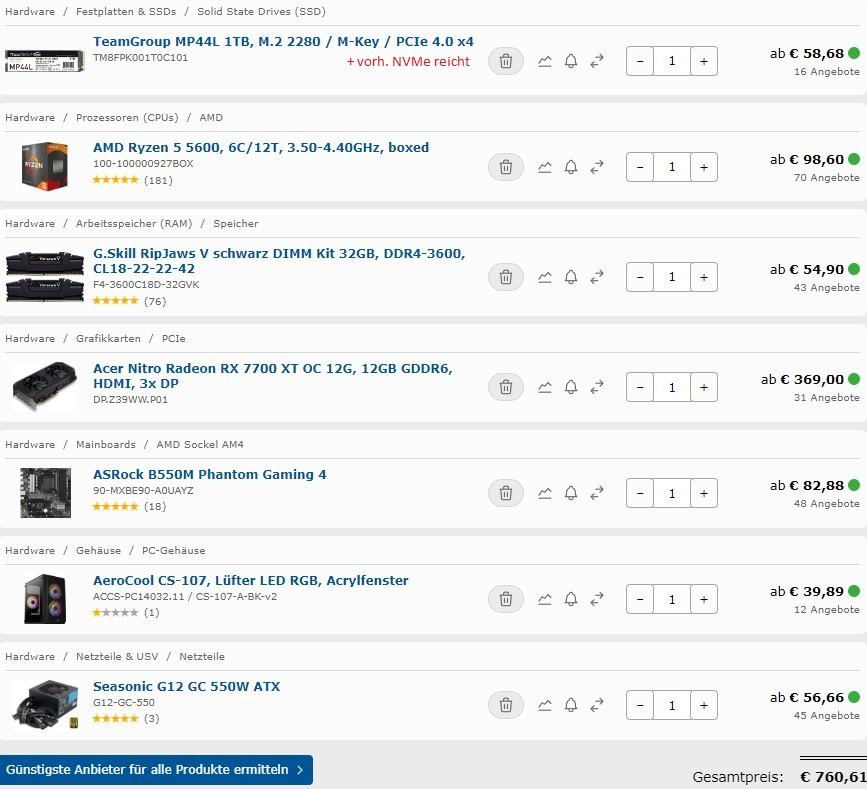 Die Hauptemfehlung Radeon RX7600 mit nur 8 GB Speicher muss im 700-Euro-PC entweder durch die inzwischen unter 300 Euro günstige RX7600XT oder gegen eine RX6750 XT getauscht werden. Die RX7600 mit 8 GB Speicher kann als Alternative in das günstigste System verschoben werden.