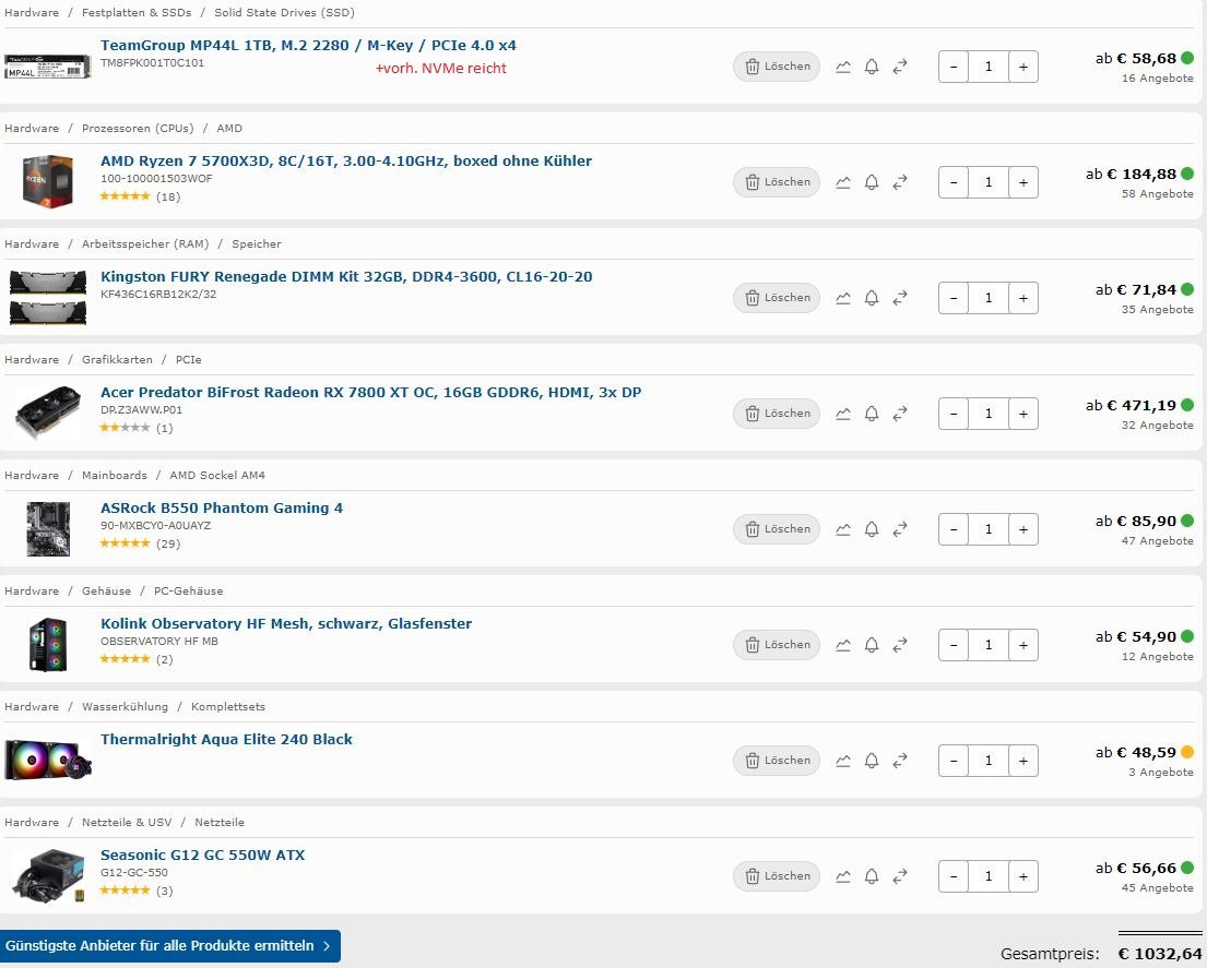 Der Ryzen 7 7800X3D muss in der 1500-Euro-Wunschliste durch einen normalen Ryzen 7 7700X ersetzt werden, da der 7800 X3D teurer geworden ist und das Budget sprengt.